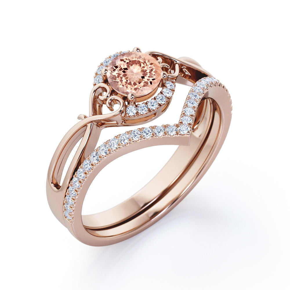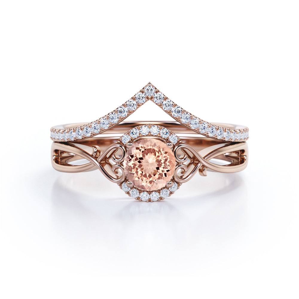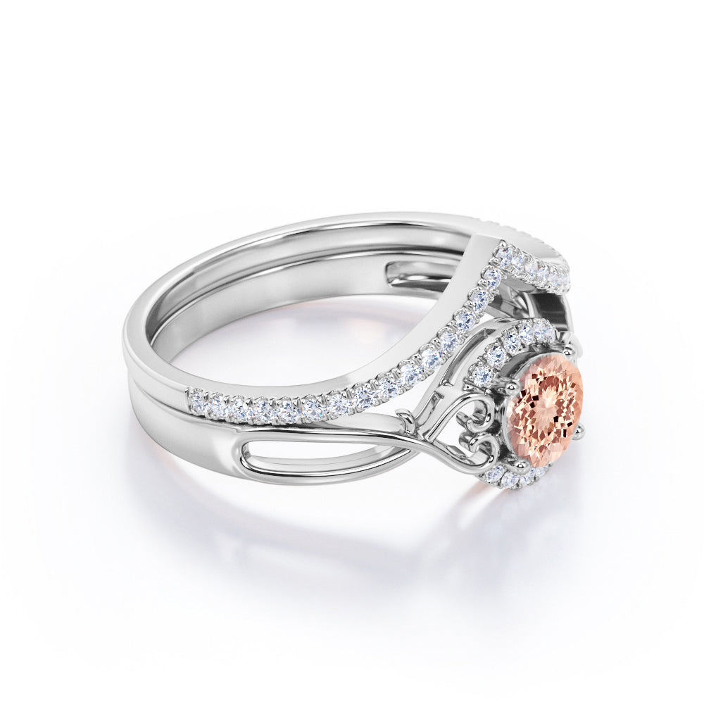1.50 Carat Round Cut Morganite and Diamond Halo Bridal Ring Set in Solid 10K Rose Gold