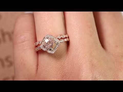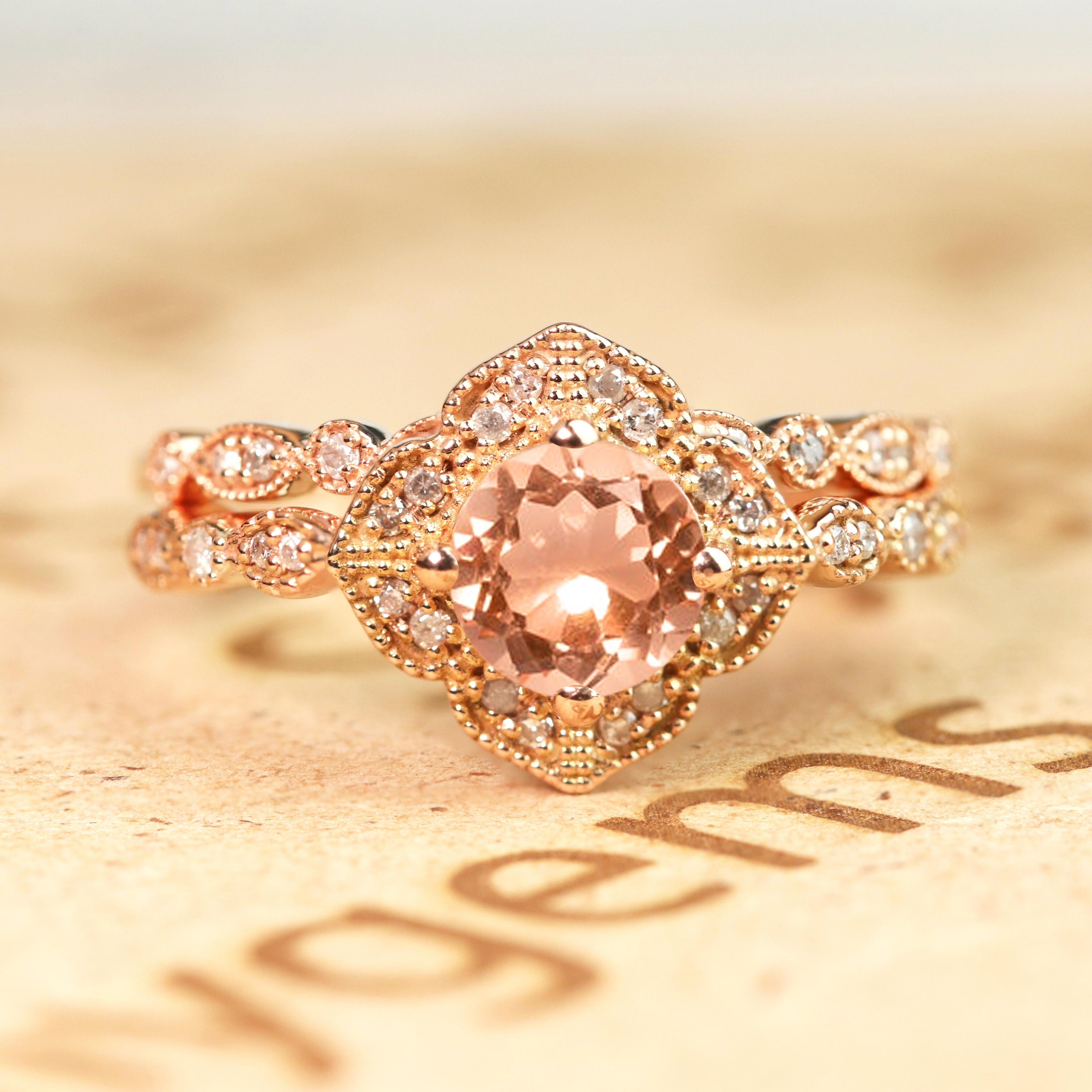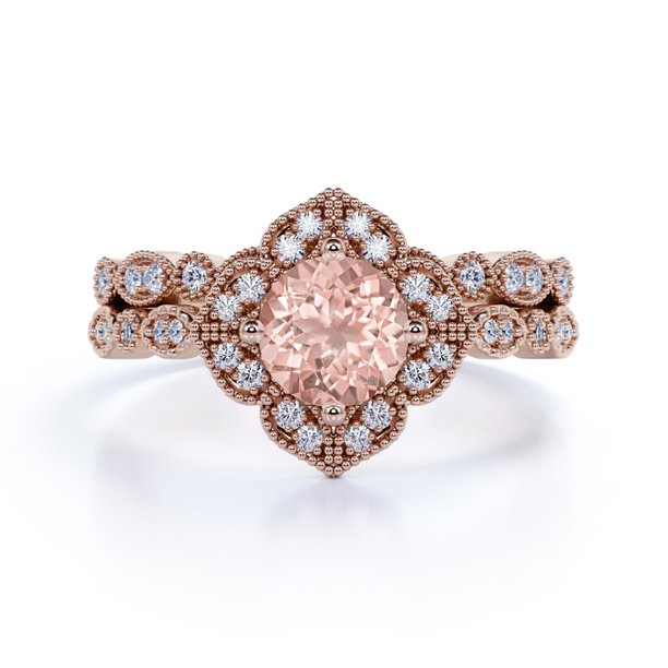 1.50 carat Round Cut Morganite and Diamond Halo Bridal Wedding Ring Set in Rose Gold: Bestselling Design Under Dollar 500