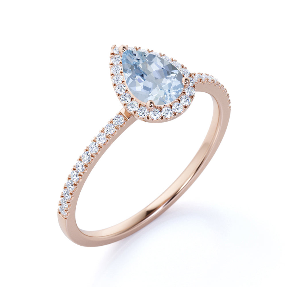 When you are looking for engagement rings, wedding rings, promise rings, anniversary rings, or any other rings, your mind may automatically think of Moissanites. But that doesn't have to be your only option. This 1.50 Carat Pear Shaped Aquamarine and Moissanite Halo Wedding Ring in 18k Rose Gold over Silver will show you why. Inspired by a vintage design, this Aquamarine wedding ring can be worn as a stand-alone piece. Create your own unique look with this sky blue Aquamarine ring and stand out from the rest. It features 1 carat pear cut blue Aquamarine and 0.50 carat real Moissanites. Also, as your satisfaction is our most priority, we will do our best to have your handmade jewelry be carefully and beautifully crafted by our expert jewelers. The order also comes with a 30-day full refund policy.