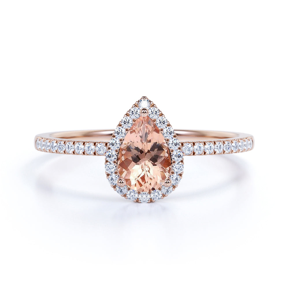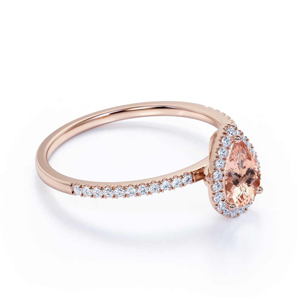 1.50 ct Pear Shaped Morganite with Moissanite Halo Engagement Ring in 18K Rose Gold over Silver