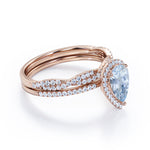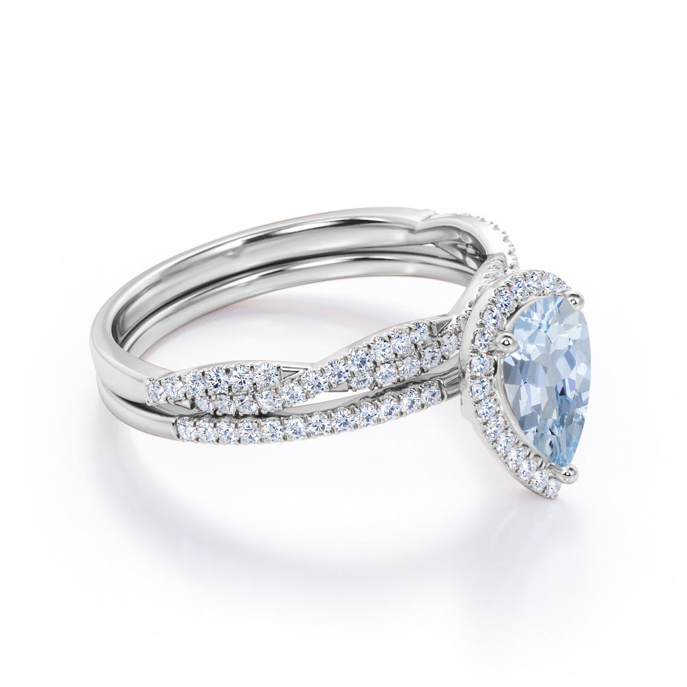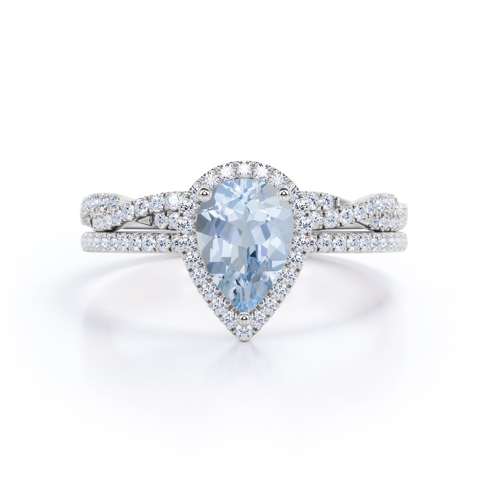 1.65 Carat Pear Cut Aquamarine And Diamond Halo Wedding Ring Set In White Gold. Your wedding day will surely be remarkable with this exceptional wedding ring set. Paved glittering diamonds surround the center stone in a halo setting creating a magnificent brilliance to the ring together with the brilliantly sparkling twisted matching wedding band. Not only perfect for your big day, but this refreshingly beautiful bridal set is also perfect for your everyday wear as it would absolutely match any outfit you wear. Handcrafted with passion, this exceptional wedding ring set features a 1 carat perfect blue pear-cut aquamarine, surrounded by, 0.65 carat brilliantly sparkling diamond side stones for the gold rings and moissanite for the silver rings. Striking in white gold, this remarkable bridal set is also available in rose gold, yellow gold, and black gold. Also, it can be made between 18k gold over silver, 10k gold, and 14k gold depending on your preferred customization. Please kindly note for the silver ring option that silver is a very sensitive metal, any chemicals like hand creams, lotion, or sanitizers. etc., can affect the plating.
