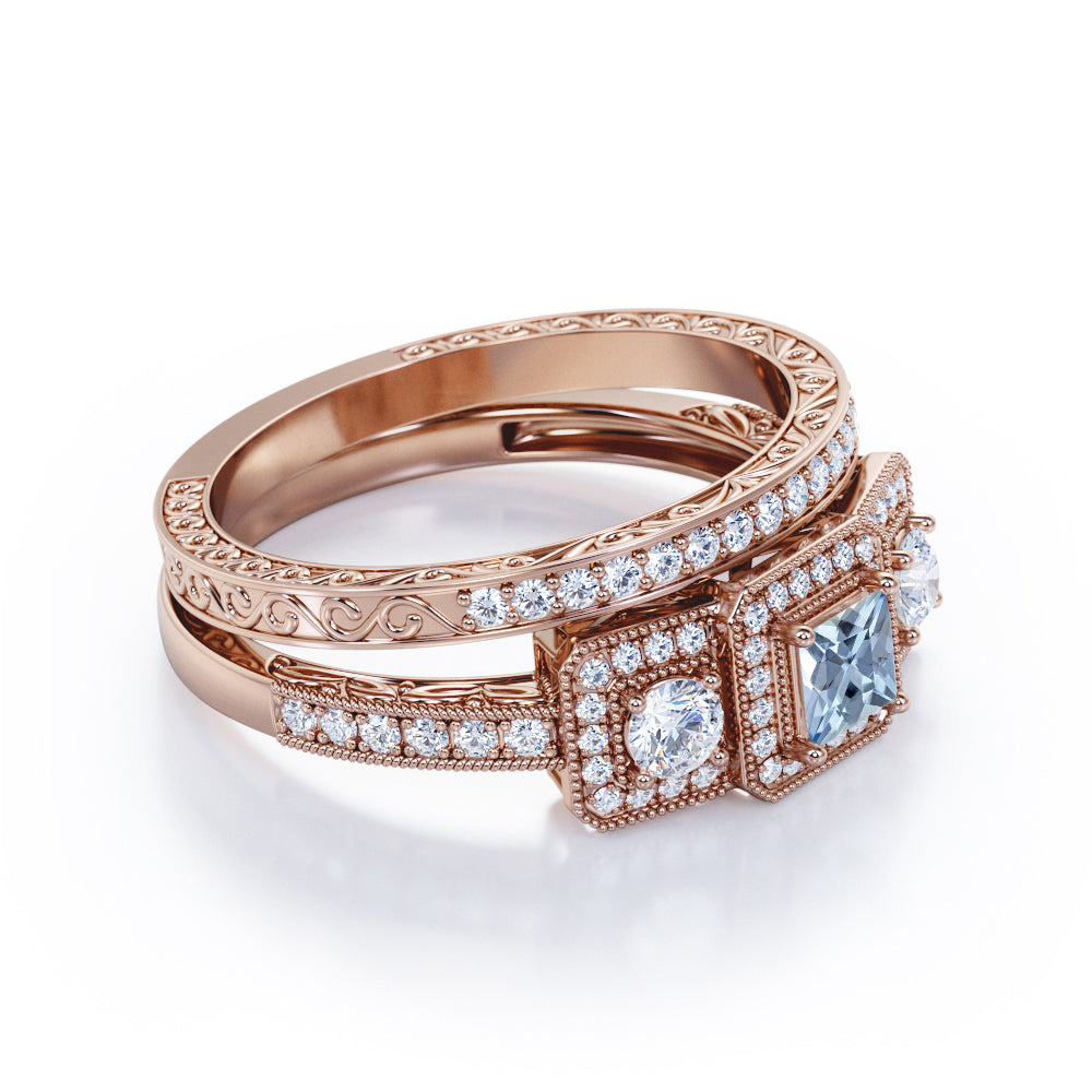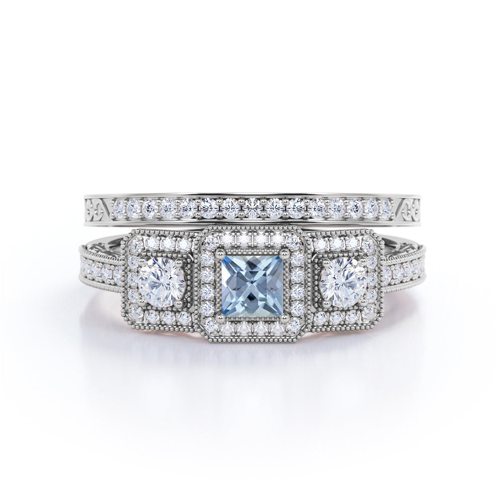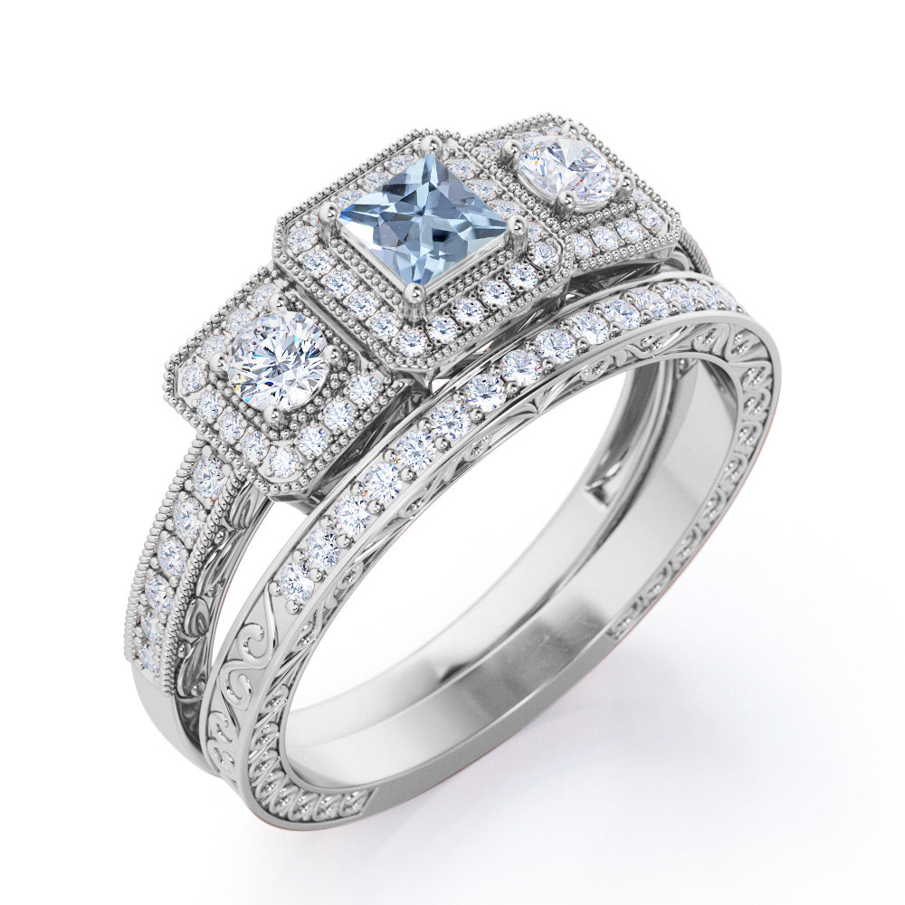 1.65 Carat Princess Cut Aquamarine And Diamond Halo Wedding Ring Set In White Gold. Exquisite and breathtaking, this triple halo bridal set is truly fascinating. A perfect blue aquamarine center stone is surrounded by dazzling diamonds set in a halo along with diamond side stones on each side also surrounded by smaller round diamonds also set in a halo that sparkles brilliantly. Paved diamonds are also settled in the ring band adding extra brilliance along with the intricate milgrain detailing that perfectly complements the ring design perfect for those who are all about sparkle and shine. Handcrafted with passion, this timeless wedding ring set features a 0.75 carat perfect blue princess-cut aquamarine, surrounded by, 0.9 carat dazzling diamond side stones for the gold rings and moissanite for the silver rings. Exquisitely stunning in white gold, this wedding ring set is also available in rose gold, yellow gold, and black gold. Also, it can be made between 18k gold over silver, 10k gold, or 14k gold depending on your preferred customization. Please kindly note for the silver ring option that silver is a very sensitive metal, any chemicals like hand creams, lotion, or sanitizers. etc., can affect the plating.