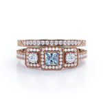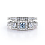 1.65 Carat Princess Cut Aquamarine And Diamond Halo Wedding Ring Set In White Gold