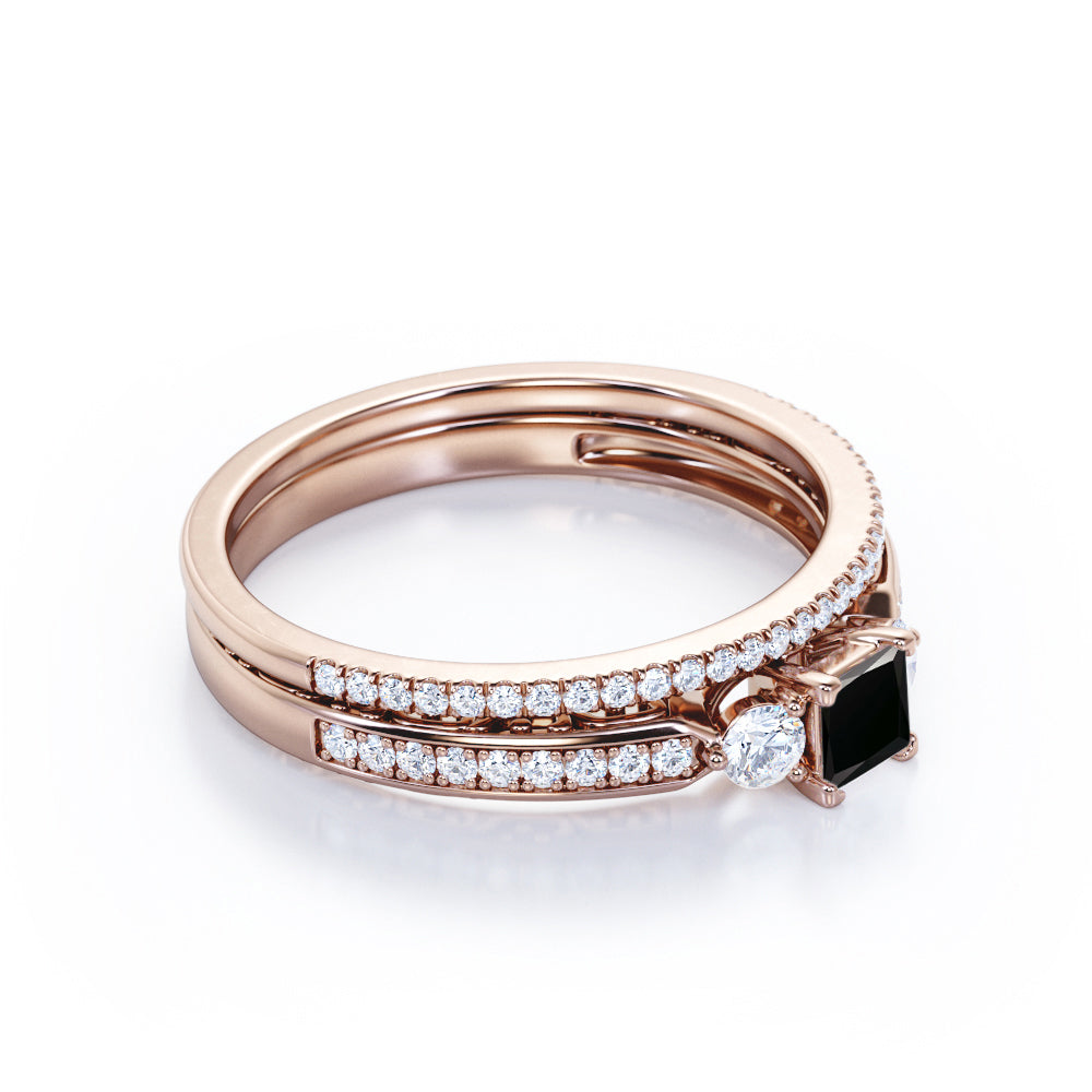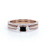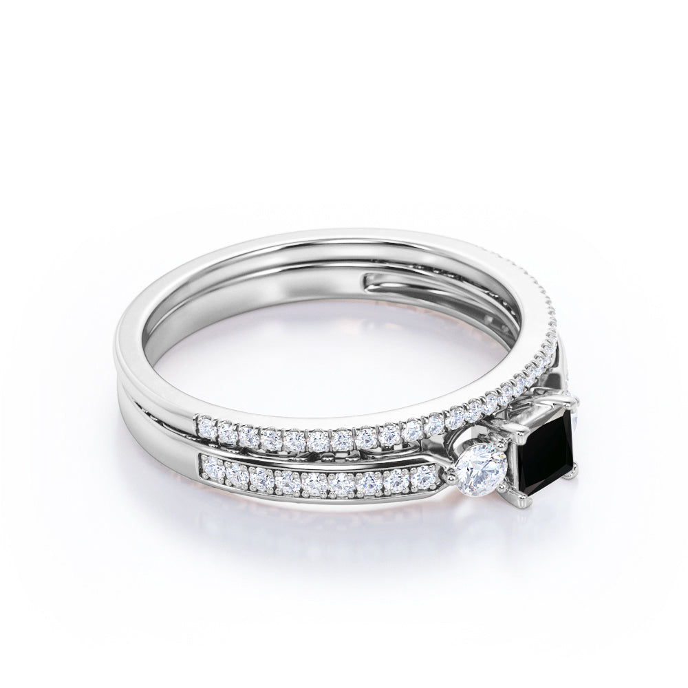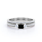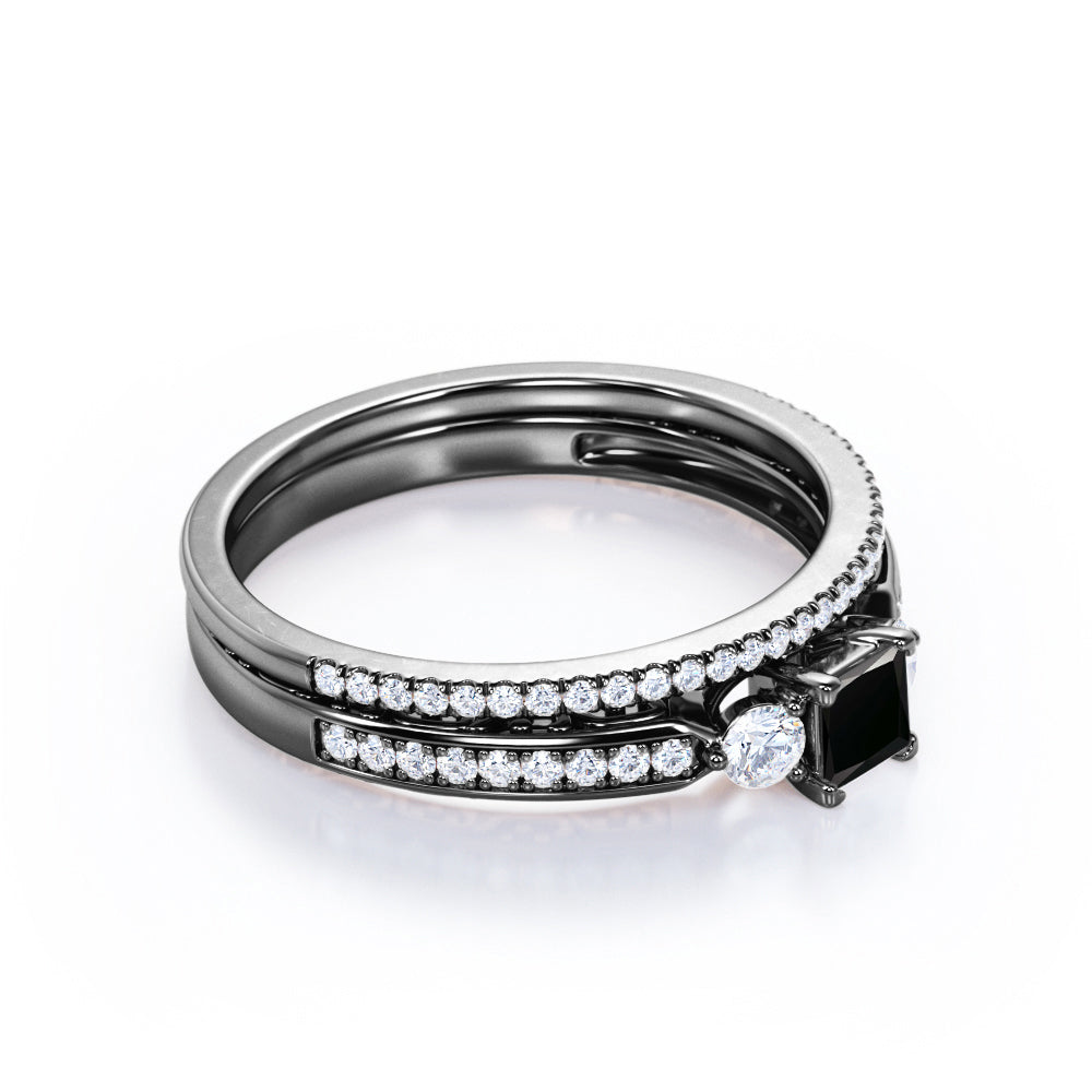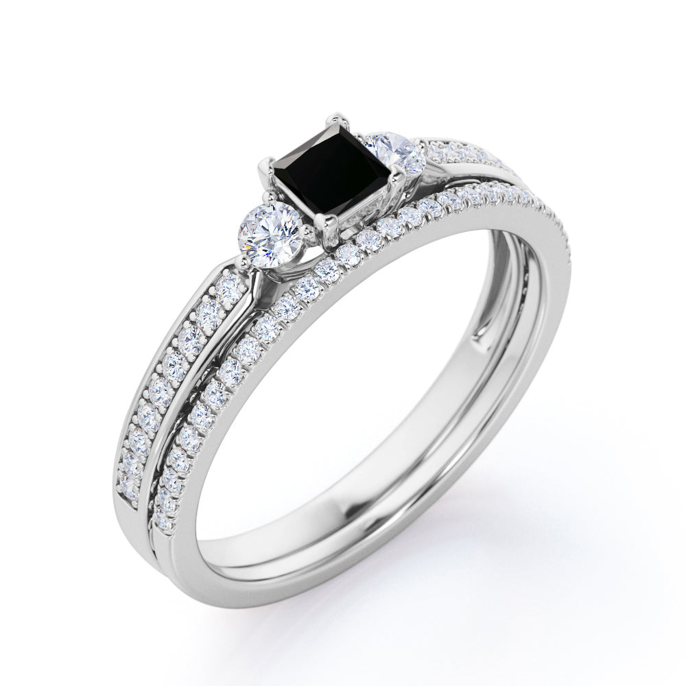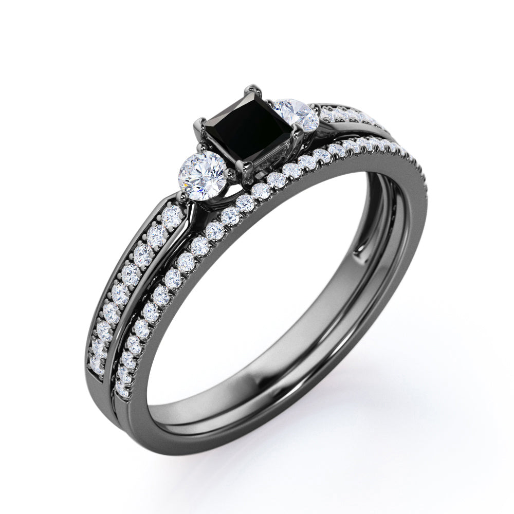 1.65 carat princess cut Lab Grown Black Diamond three stone vintage wedding ring in white gold. This three stone Lab Grown Black Diamond ring is ideal for those who appreciate traditional, antique, and vintage jewelry styles. For women, this genuine Lab Grown Black Diamond ring also makes a lovely engagement, anniversary, or promise ring. This princess cut stunning Lab Grown Black Diamond ring will complement any woman's jewelry collection. As the center stone, it has 1 carat genuine Lab Grown Black Diamond. Its allure is enhanced by a delicate combination of sparkling diamond side stones totaling 0.65 carats inclusive of matching wedding band. This vintage wedding ring with channel setting can also be customized to 10k Gold, 14k Gold as per your desire.