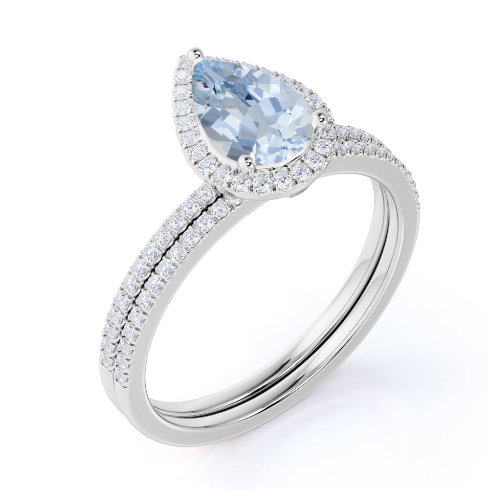 1.75 Carat Pear Cut Aquamarine and Moissanite Halo Wedding Ring Set in 18k White Gold over Silver