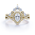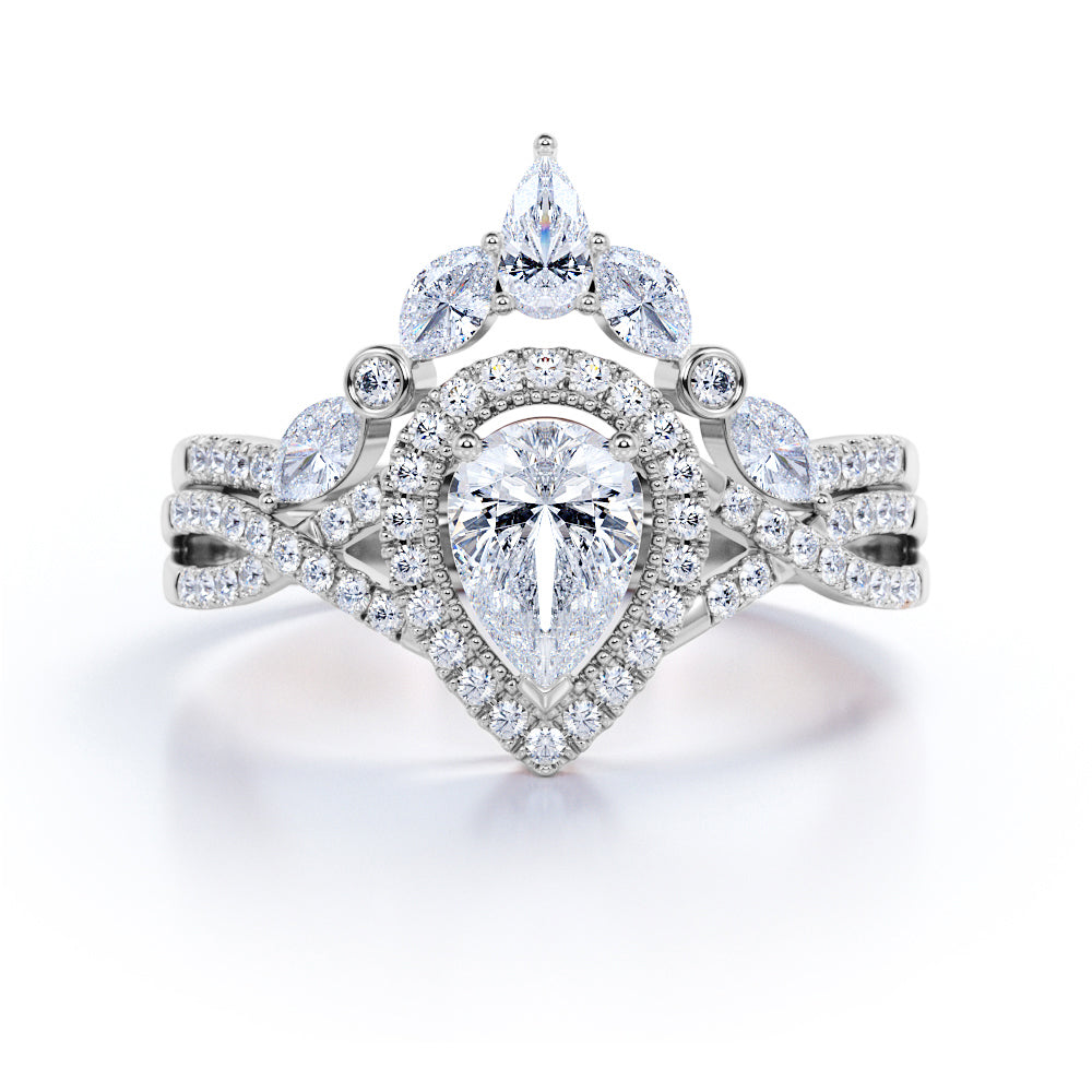 1.25 Carat Pear Cut Moissanite Bohemian Wedding Set - Infinity Engagement Ring with Art Deco Wedding Band in 10k White Gold