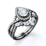 Treasure your relationship with this 1.25 Carat Pear Cut Moissanite Bohemian Wedding Set - Infinity Engagement Ring with Art Deco Wedding Band in 10k White Gold. This Bohemian-inspired bridal set showcases a 1 carat pear cut moissanite as the center stone and 0.25 carat marquise, round and pear shaped high quality zirconium side stones on both rings. The halo engagement ring comes with an exquisite curved wedding band which very well makes this ring set beyond stunning. Moreover, this one of a kind ring set can be customized to 10k White Gold, Rose Gold, Yellow Gold or Black Gold as per your selection. Also, as your satisfaction is our most priority, we will do our best to have your handmade jewelry be carefully and beautifully crafted by our expert jewelers. The order also comes with an elegant jewelry ring box and with 30 days full refund policy. Sparks your love life with this exquisite designer moissanite ring set. Go safe with the classic moissanite rings, they are made to impress. Express your gratitude for your significant person with our handcrafted moissanite rings. Meaningful and timeless, moissanite jewelry is a genuine gift that anyone would appreciate. Looking for a luxurious gift on the budget? Be sure to add this glorious moissanite ring set to cart because it is the most affordable you can find.