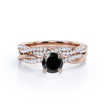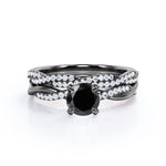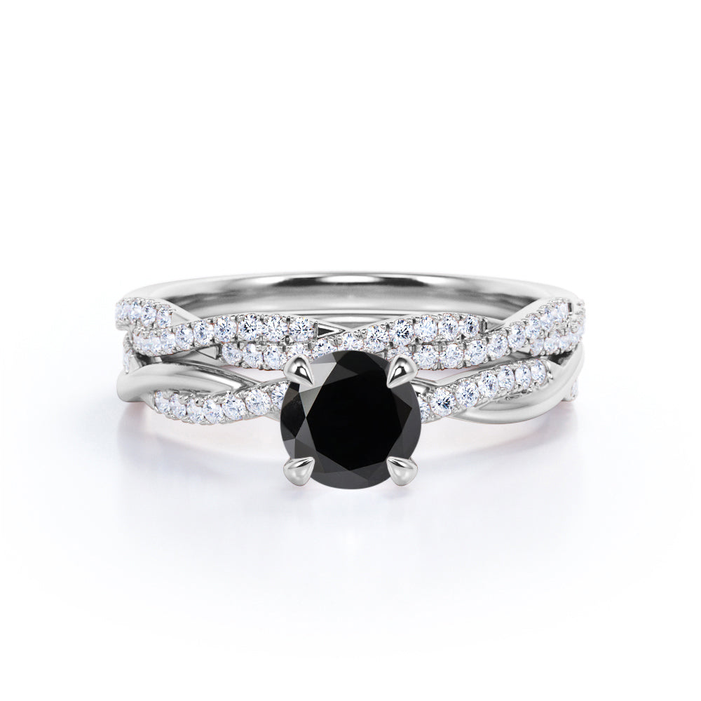 1.75 carat round cut Black Diamond twisted wedding ring set in white gold. Put the sparkle in her eyes by getting our sparkling Black Diamond infinity wedding ring set. The set includes round cut Black Diamond infinity engagement ring and a matching infinity wedding band to complete your look. The infinity engagement ring weighs 1.25 carat and the wedding band weighs 0.50 carat which makes the total of 2 carat weight for the wedding set. The prong setting in the ring offers a classic look and enhances the brilliance as well. This solitaire infinity wedding set in white gold will do all the talking for you. Grab it now or worry later, the choice is all yours. This 1.75 carat round cut Black Diamond twisted wedding ring set in white gold can also be customized to 10k Gold, 14k Gold.