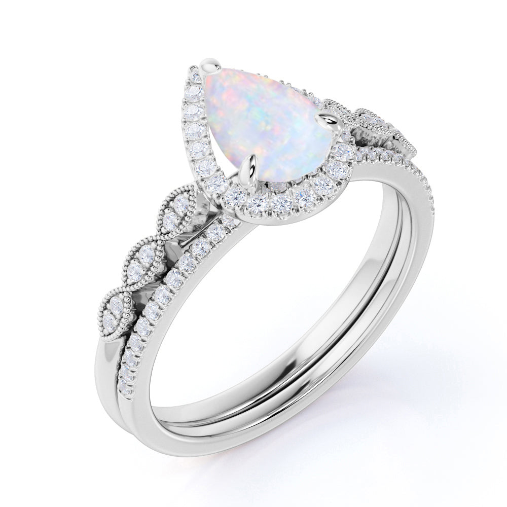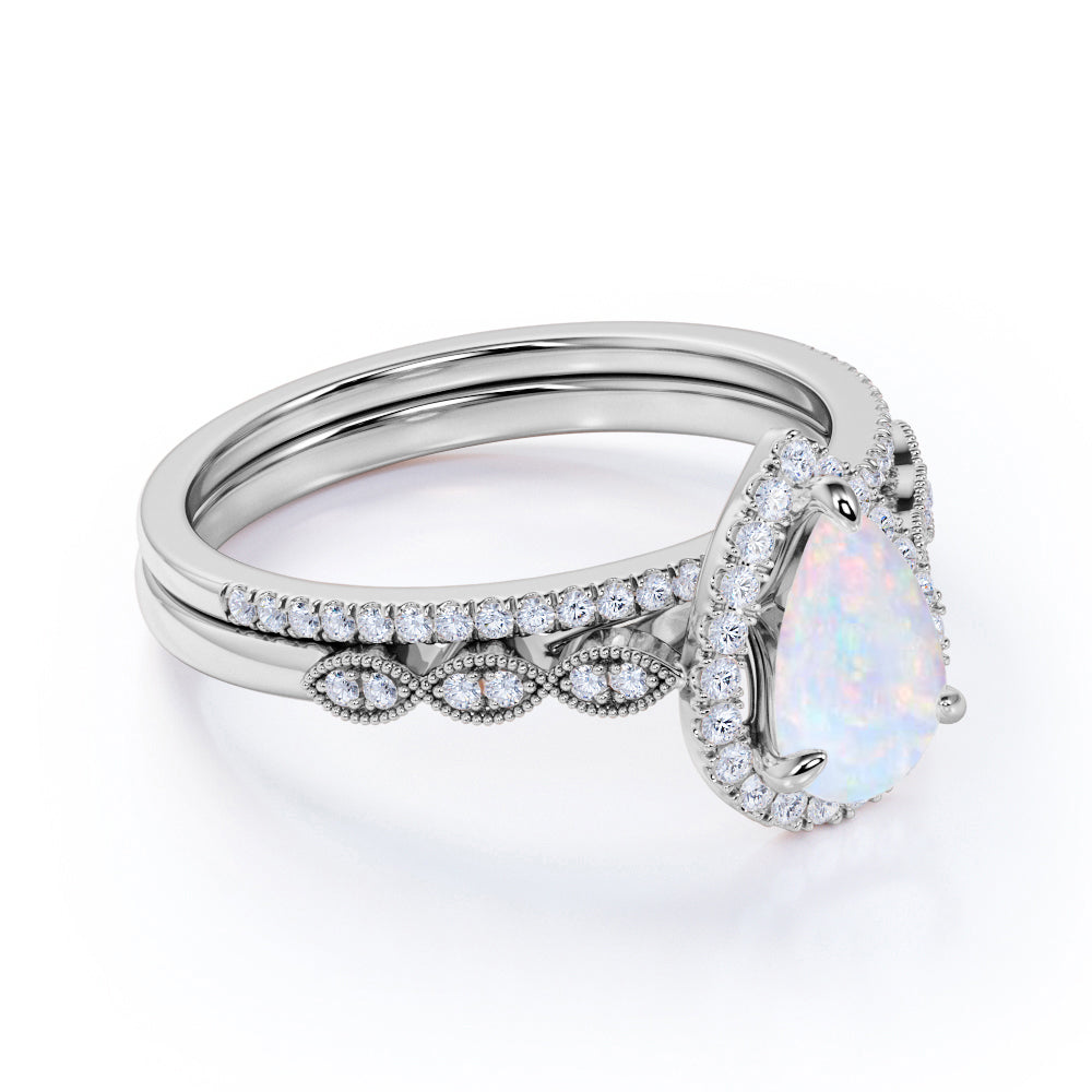 1.75 ct Antique Pear Shaped Fire Opal and Moissanite Wedding Ring Set in 18K White Gold over Silver