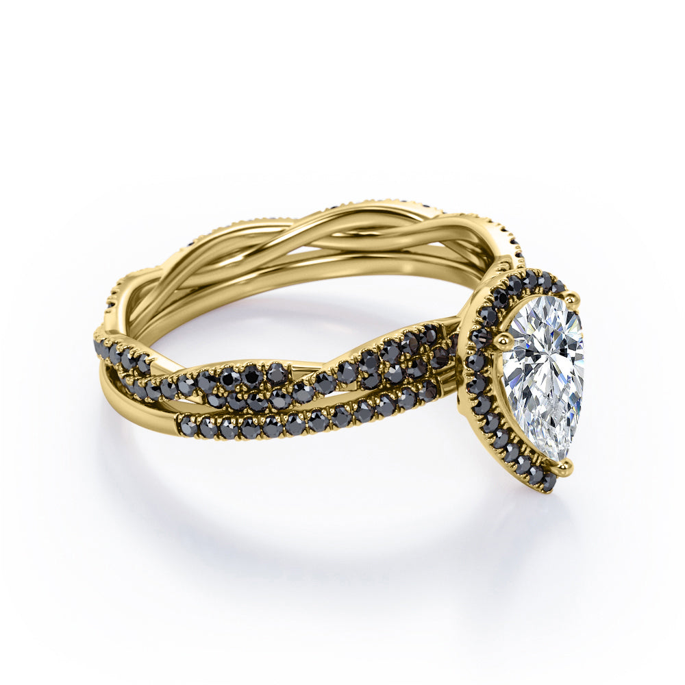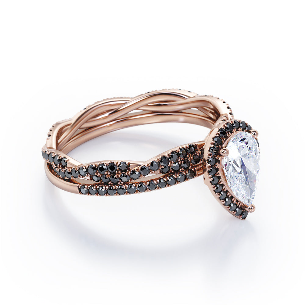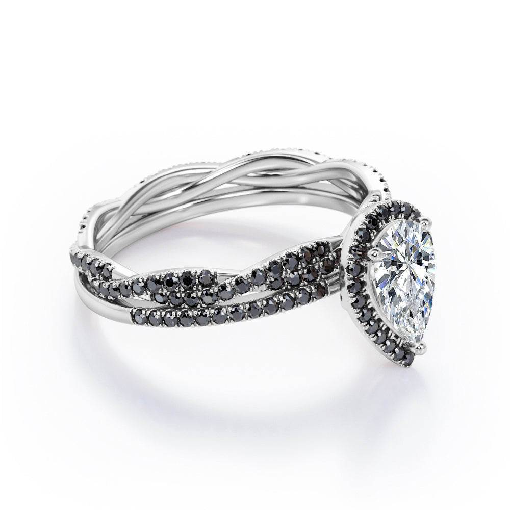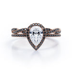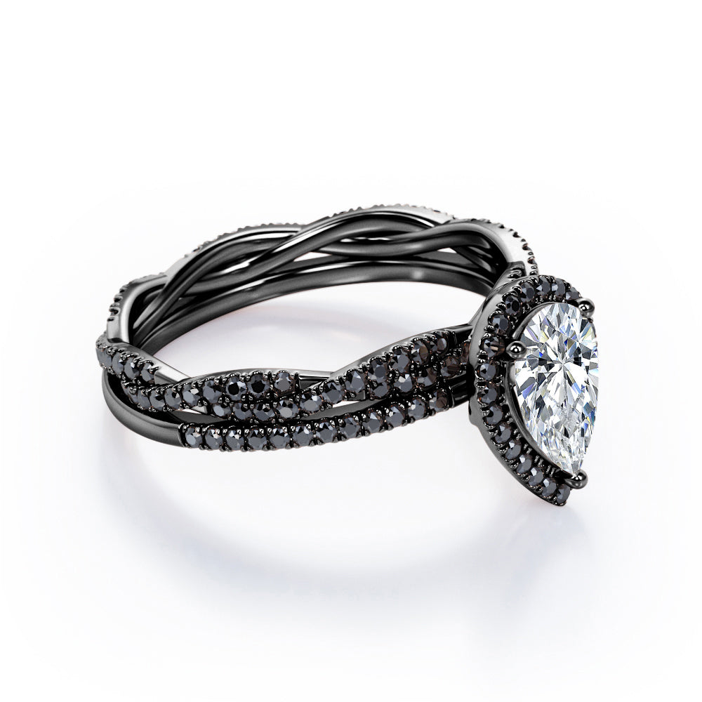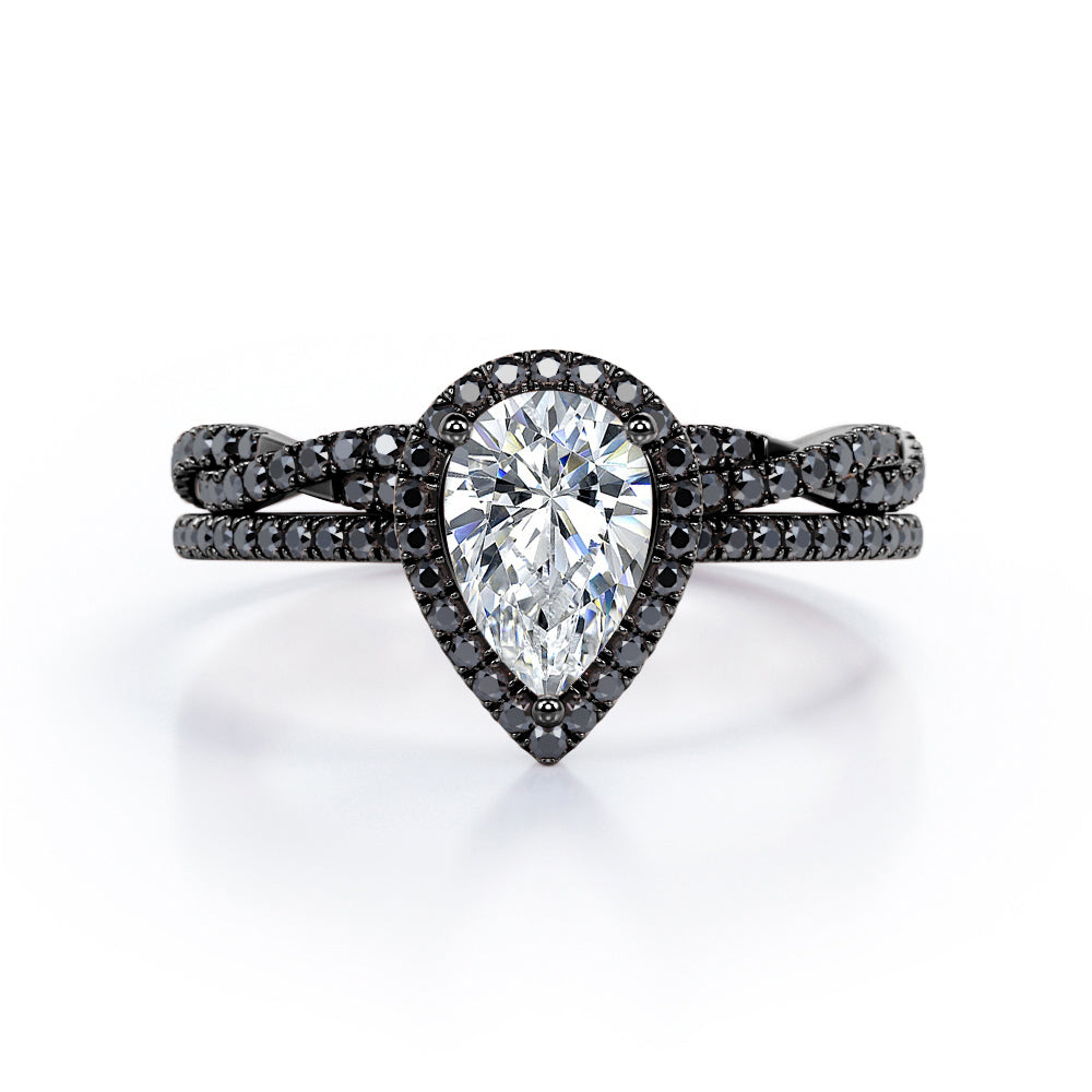 1.75 TCW Pear Shape Moissanite with Lab Created Black Diamond - Pave Setting - Crossover Eternity Wedding Set in Black Gold