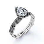 Paint your love story with this 1.75 TCW Pear Shape Moissanite with Lab Created Black Diamond - Pave Setting - Crossover Eternity Wedding Set in Black gold. Skillfully hand-cut into a nice pear cut by our experts in lapidary, this appealing moissanite wedding bands set features total 1.75 carat moissanite and lab-created black diamonds. Special and non-traditional, this moissanite wedding bands set is perfect for those who would love to express their charisma and uniqueness. With naked eyes moissanites look, shine and feel exactly like diamonds. With its glory and clarity, this moissanite jewelry will absolutely enhance every style of its wearer. This moissanite band set is beautiful and accessible since it is available at a reasonable price. Moissanites are the most popular alternative gemstone for diamonds while being at lower and more affordable price. Considered as a symbol of timeless love and affection for your lover, this moissanite wedding band set, the birthstone ring for the fourth month, symbolizing an unbreakable love and strength, will surely be the best choice. Also, this moissanite engagement rings set can be customized, either in white gold, rose gold, yellow gold or black gold in 18k Gold over Silver, 10k and 14k gold metal options upon customer request. In regards to its hardness, moissanite is almost as hard as diamond which means that it is notably durable. Let’s impress her with this moissanite wedding bands set, and she will be eternally joyful.