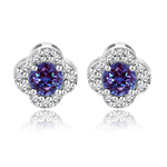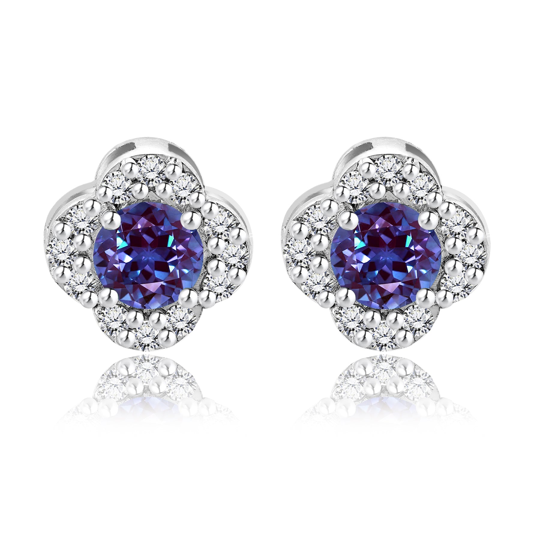 1 carat Beautiful Flower Halo Round Shaped - Alexandrite - June Birthstone Stud Earrings in 18K White Gold over Silver