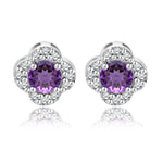 1 carat Beautiful Flower Halo Round Shaped - Amethyst - February Birthstone Stud Earrings in 18K White Gold over Silver