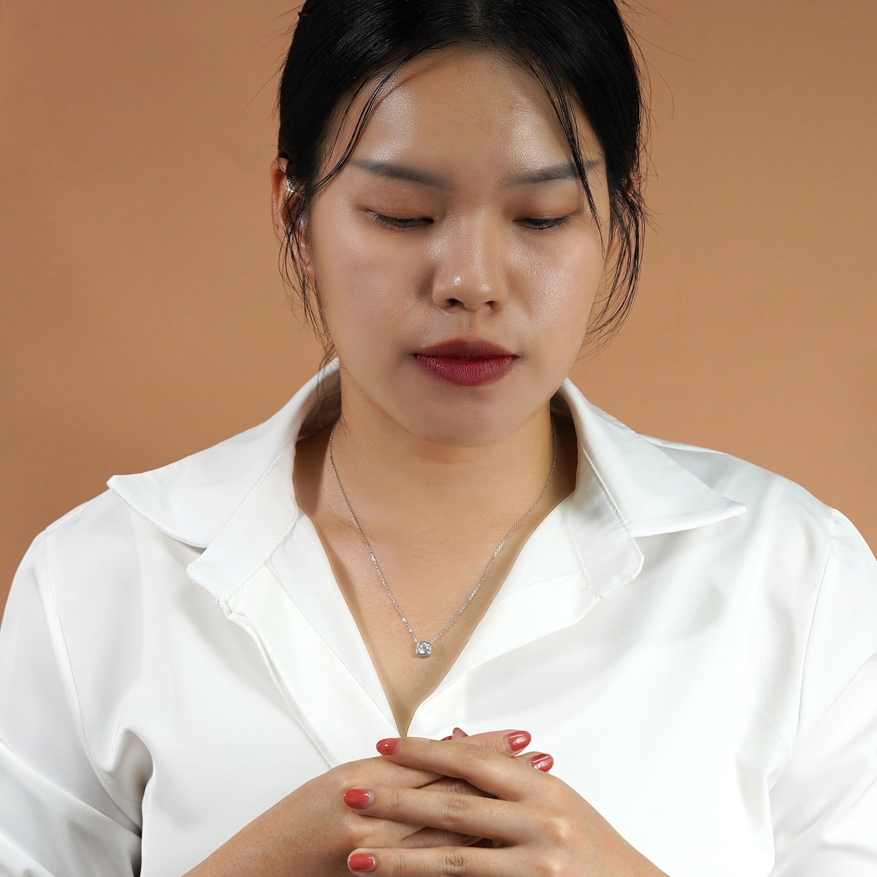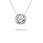 Become a fashion icon with this adorable 1 Carat Cushion Cut Moissanite Floating Bezel Slider Pendant Necklace in 18K White Gold over Silver. This single pendant necklace is the ultimate accessory for those who appreciate the timeless beauty of a classic pendant with a modern twist. This slide pendant necklace features a stunning 1 carat cushion cut Moissanite gemstone, expertly set in a delicate necklace bezel setting in 18K gold over silver. The bezel set pendant necklace design ensures that your precious gemstone is securely nestled within the pendant, offering both protection and a sleek, minimalist aesthetic. While hosting the essence of a classic pendant, the slider pendant necklace also adds a contemporary touch, allowing you to effortlessly adjust the length to suit your style and comfort. It's a versatile women's minimalist necklace that effortlessly transitions from day to night, making this necklace bezel setting the perfect choice for any occasion.