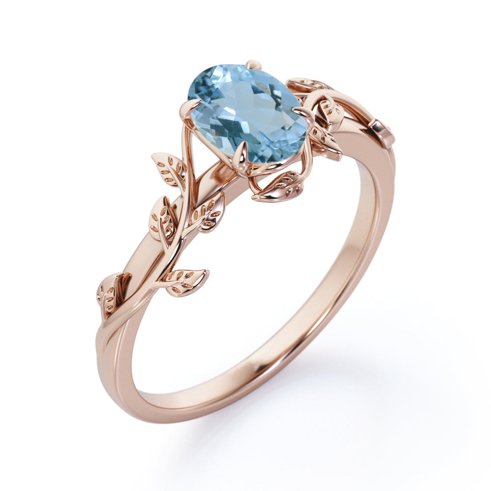 1 Carat Oval Cut Aquamarine Leaf And Vine Engagement Ring In White Gold. A simple piece yet remarkably eye-catching. This antique solitaire engagement ring is simply adorable. A beautifully handcrafted leaf and vine design perfectly detailed by our talented and experienced jewelers highlight this gorgeous ring. The very fine blue aquamarine center stone is prong-set securely holding the stone in place. Handcrafted to perfection, this nature-inspired engagement ring features a 1 carat perfect blue oval aquamarine gemstone. This can also be a great piece for your everyday will as it would certainly match any outfit you wear. Lovely in white gold, this promise ring is also available in rose gold, yellow gold, and black gold. Also, it can be made between 18k gold over silver, 10k gold, and 14k gold depending on your preferred customization. Please kindly note for the silver ring option that silver is a very sensitive metal, any chemicals like hand creams, lotion, sanitizers. etc., can affect the plating.