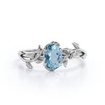 1 Carat Oval Cut Aquamarine Leaf And Vine Engagement Ring In White Gold. A simple piece yet remarkably eye-catching. This antique solitaire engagement ring is simply adorable. A beautifully handcrafted leaf and vine design perfectly detailed by our talented and experienced jewelers highlight this gorgeous ring. The very fine blue aquamarine center stone is prong-set securely holding the stone in place. Handcrafted to perfection, this nature-inspired engagement ring features a 1 carat perfect blue oval aquamarine gemstone. This can also be a great piece for your everyday will as it would certainly match any outfit you wear. Lovely in white gold, this promise ring is also available in rose gold, yellow gold, and black gold. Also, it can be made between 18k gold over silver, 10k gold, and 14k gold depending on your preferred customization. Please kindly note for the silver ring option that silver is a very sensitive metal, any chemicals like hand creams, lotion, sanitizers. etc., can affect the plating.