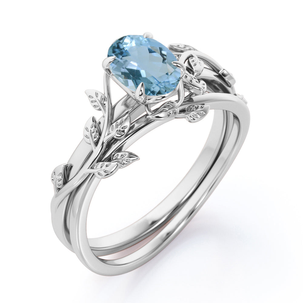 1 Carat Oval Cut Aquamarine Minimalist Wedding Ring Set In White Gold. This remarkably eye-catching bridal set is perfect for your wedding day. This antique solitaire wedding ring set will certainly flatter her heart. The set highlights a beautifully handcrafted leaf and vine design for the engagement ring and the matching wedding band detailed to perfection by our talented and experienced jewelers. Handcrafted with passion, this antique set is made with 1 carat of perfect blue oval-cut aquamarine. Charming in white gold, the set is also available in rose gold, yellow gold, and black gold. Also, it can be made between 18k gold over silver, 10k gold, and 14k gold depending on your preferred customization. Please kindly note for the silver ring option that silver is a very sensitive metal, any chemicals like hand creams, lotion, or sanitizers. etc., can affect the plating.