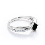 1 carat princess cut Black Diamond infinity engagement ring in white gold. Make your bond eternal and infinite by sealing her hands with our 1 carat Black Diamond infinity engagement ring. The infinity ring exhibits a 0.75 carat Princess cut lab Black diamond with 0.25 carat sparkling diamond side stones. This eye-catching cushion cut ring in white gold is handmade with love to enhance your beauty. The infinity style is a symbol of a timeless bond of love and affection that connects two people. This twisted shank piece will give a new twist to your love story. So hurry up and grab this prong set Black Diamond engagement ring before it gets sold out. This 1 carat princess cut Black Diamond infinity engagement ring in white gold can also be customized to 10k Gold, 14k Gold.