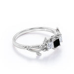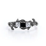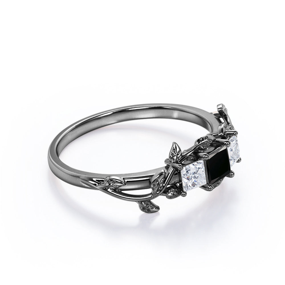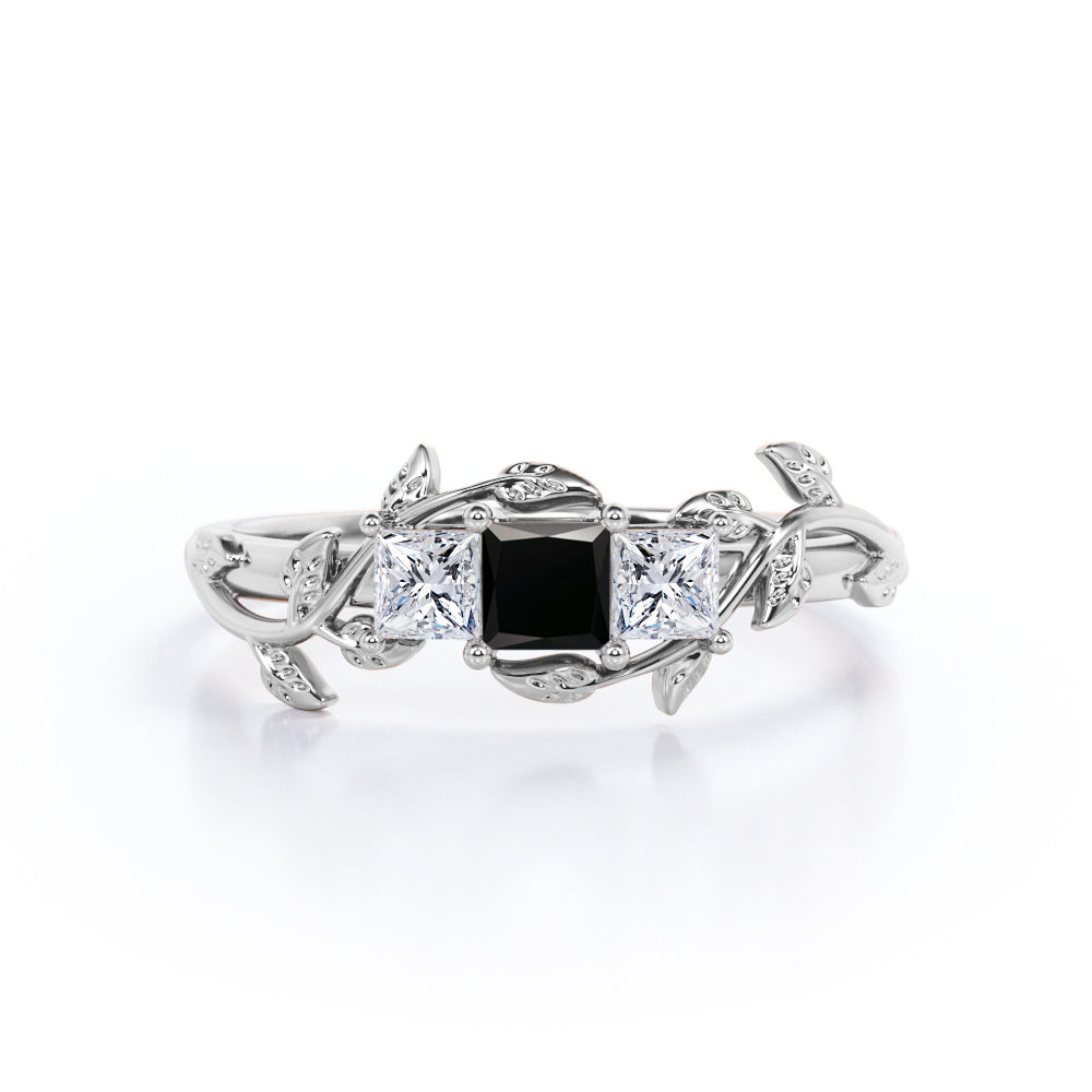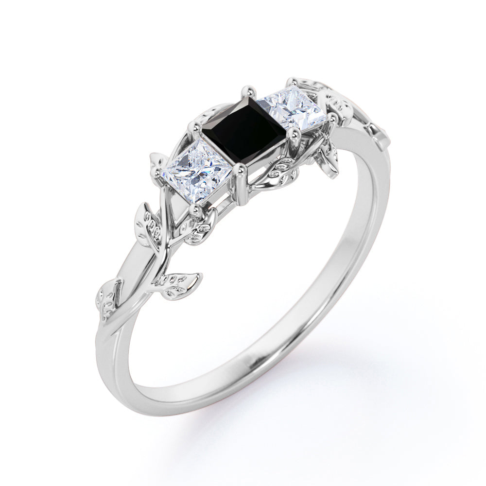 1 carat princess cut Black Diamond three stone engagement ring in white gold. Here is a ring that will show her you love her and will undeniably command attention. This G-H three stone Black Diamond engagement ring will look gorgeous on her finger. The vintage leaf style lends a touch of elegance to the ring and will look pleasing with any attire. This fetching modern art deco engagement ring will make your significant other do a double-take, winning her heart and ensuring the answer you desire. Sometimes feelings can be difficult to put into words, but the ideal engagement ring can speak for you since it will evoke feelings of delight that will last a lifetime. This 1 carat princess cut Black Diamond three stone engagement ring in white gold can also be customized to 10k Gold, 14k Gold.