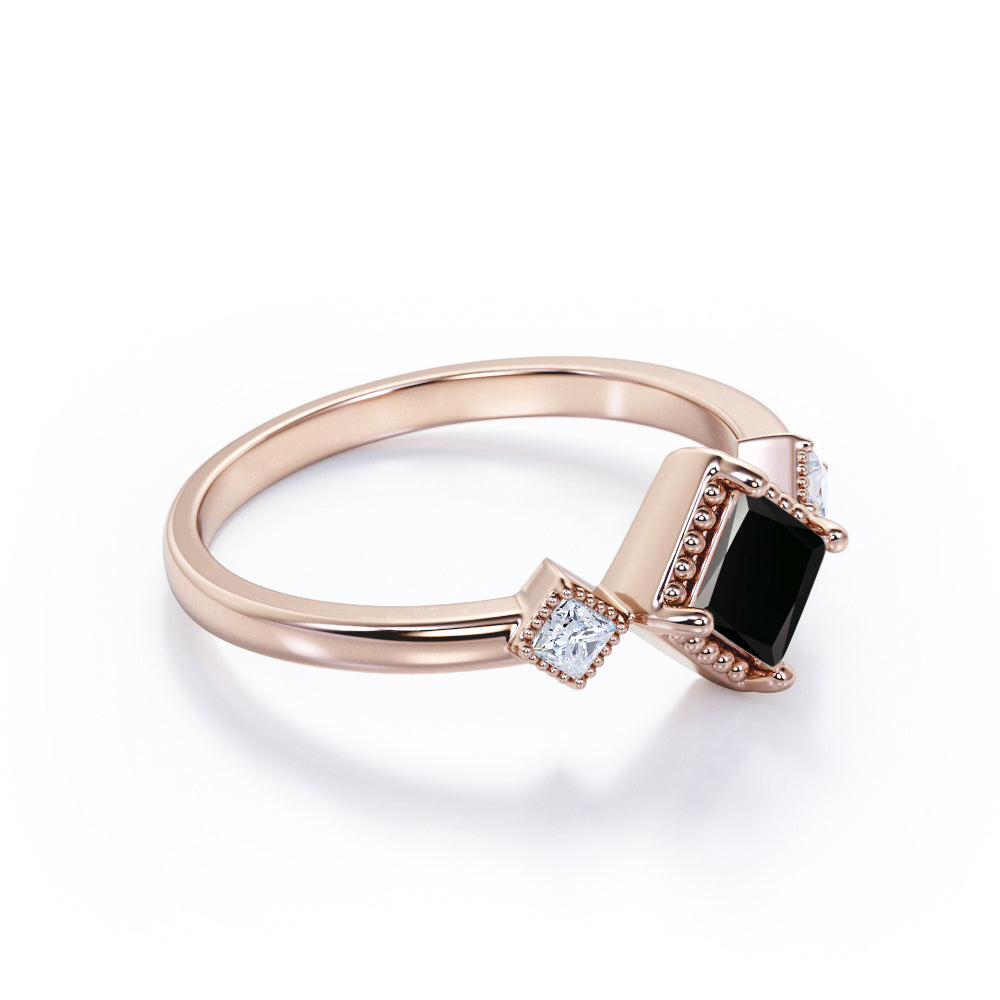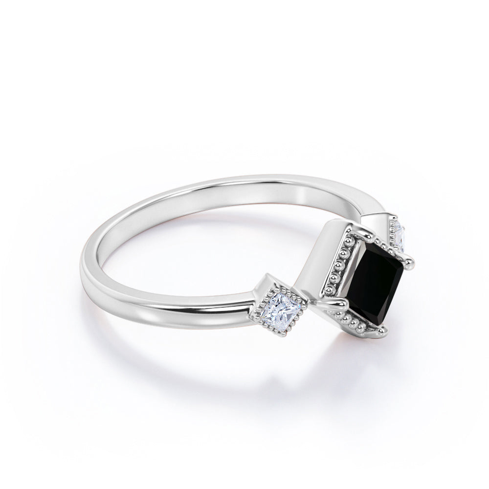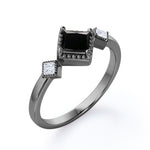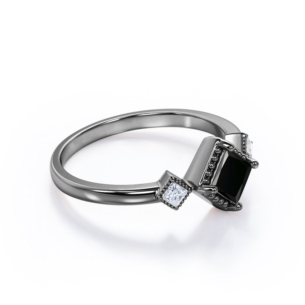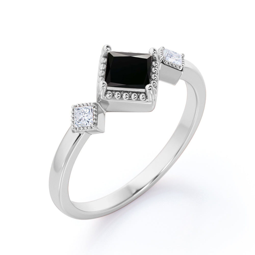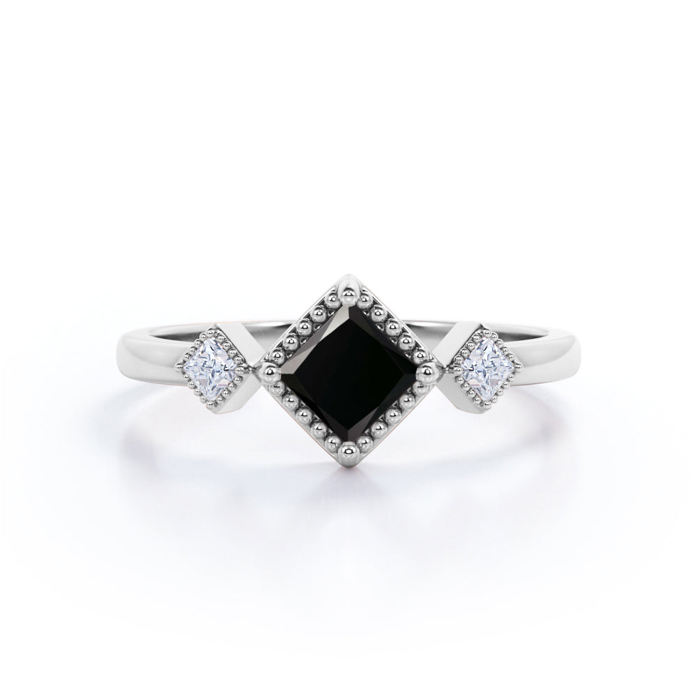 1 carat princess cut Black Diamond three stone pave engagement ring in white gold. It's okay to be a little obsessed with jewelry. Look radiant by choosing our princess cut Black Diamond engagement ring in white gold. This elegant three stone ring weighs total of 1 carat. Our three stone ring will absolutely make you outshine in a room of plenty people. The antique milgrain on the ring acts like an icing to the cake adding more charm to this unique ring. Purchase this pave setting ring now or regret dreaming about it tomorrow, the choice is all yours. This 1 carat princess cut Black Diamond three stone pave engagement ring in white gold can also be customized to 10k Gold, 14k Gold.