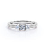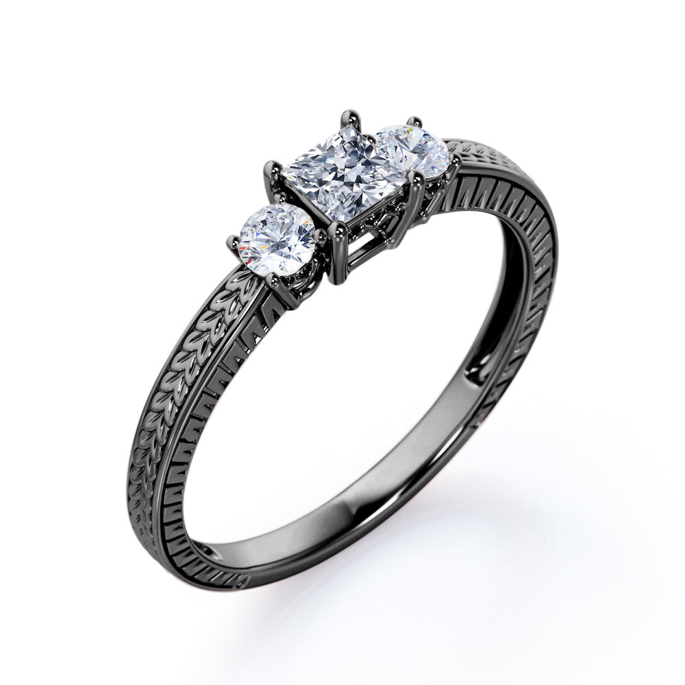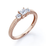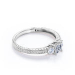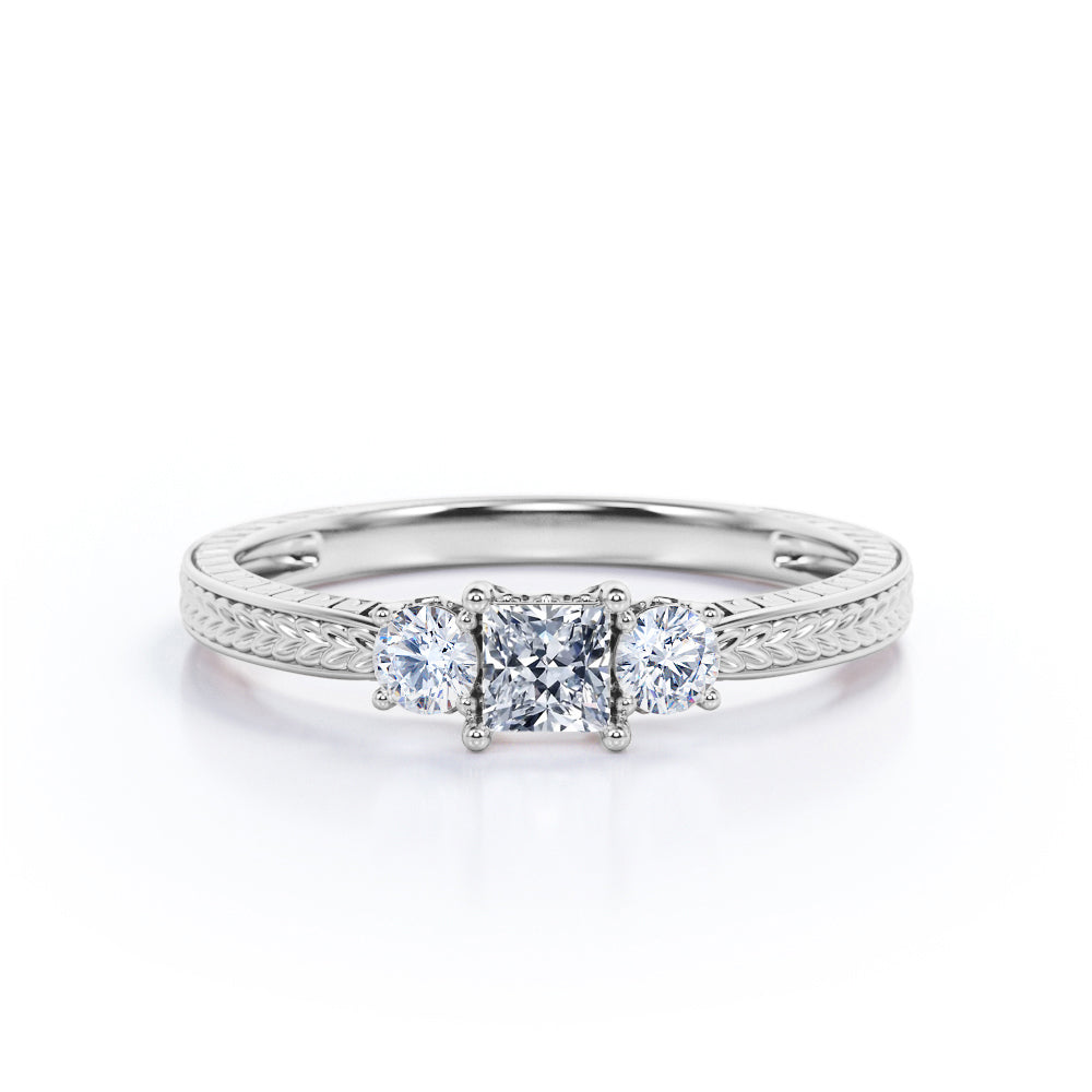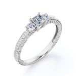 1 carat princess cut Moissanite art deco engagement ring in white gold. Mesmerizing Moissanite ring for your soulmate handmade with love and affection. Propose your dream partner with our dreamy princess cut ring in white gold. This three stone engagement ring weighs total of 1 carat. This pave setting ring emphasizes a distinctive look. This unique art deco ring is the key to the heart of your soulmate. If you want to hear a yes on your proposal day, this ring will do all the wonders. Embark your new journey of life with our tantalizing Moissanite engagement ring. This 1 carat princess cut Moissanite and diamond art deco engagement ring in white gold can also be customized to 18k Gold plating over silver, 10k Gold, 14k Gold or 18k Gold.
