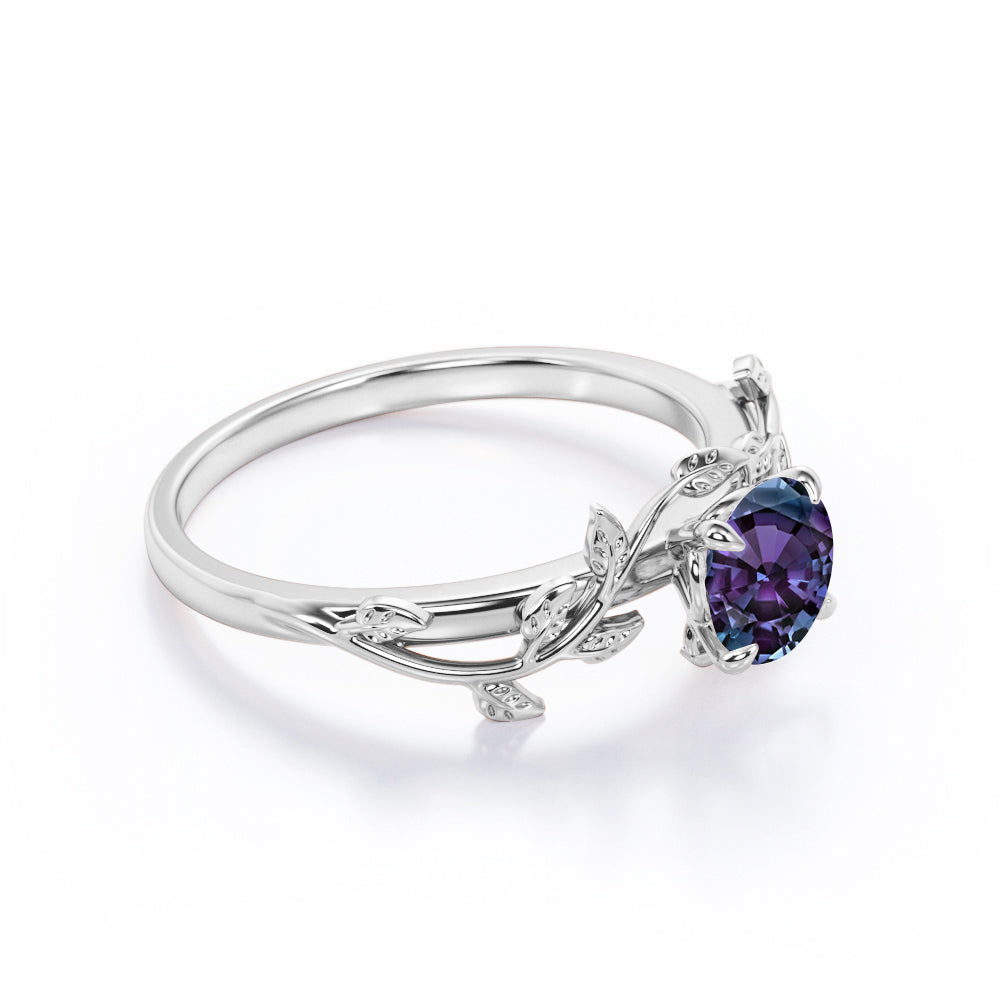 1 Carat - Round Cut Lab Created Alexandrite Ring - Leaf & Vine Engagement Ring - 18K White Gold Plating Over Silver