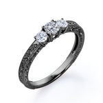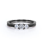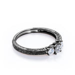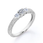 1 carat round cut Moissanite three stone engagement ring in white gold. Feel attractive in our round cut regal Moissanite ring. This exclusive piece of 1 carat exhibits strong brilliance and unbelievable sparkle. The vintage milgrain style surely makes it one of a kind of ring that can grab the attention of anyone around. The three stone in the ring symbolize a couple's past, present and future. The modern art deco adds more value to the ring and makes it more special. If you are a vintage lover, this antique milgrain ring is the perfect option to go for. This 1 carat round cut Moissanite and diamond three stone engagement ring in white gold can also be customized to 18k Gold plating over silver, 10k Gold, 14k Gold or 18k Gold.