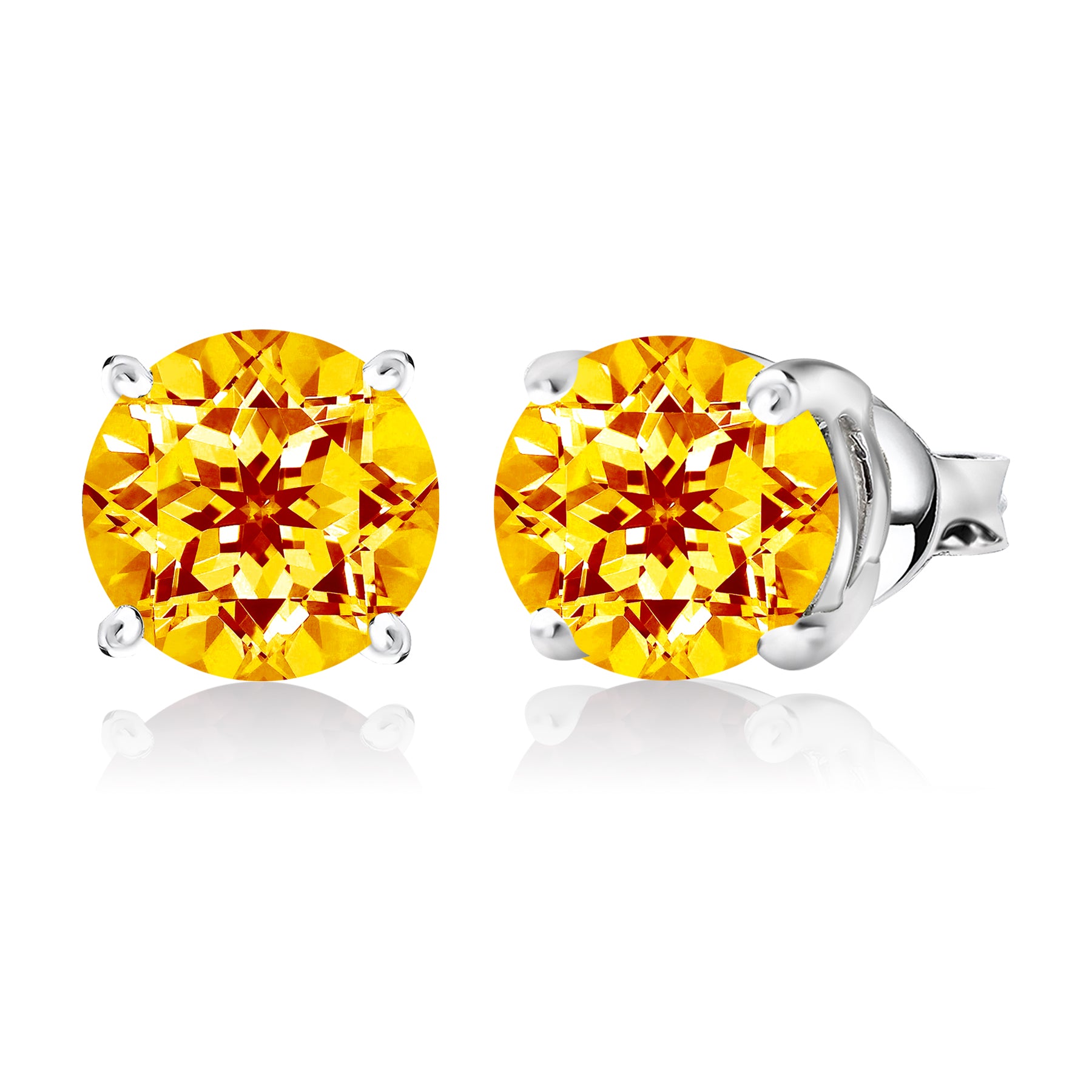 1 Carat Round Shaped - Citrine - November Birthstone Solitaire Stud Earrings in 18K White Gold Plating Over Silver
