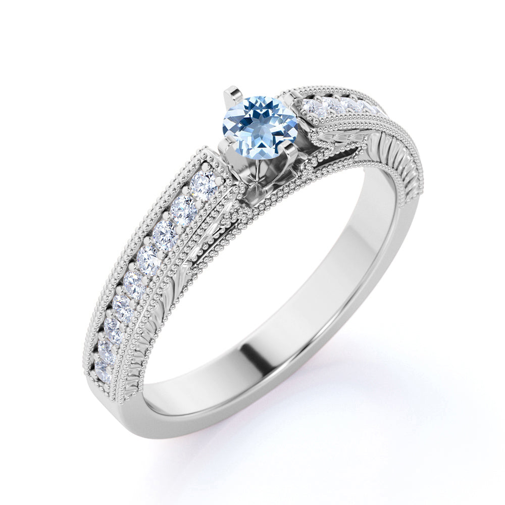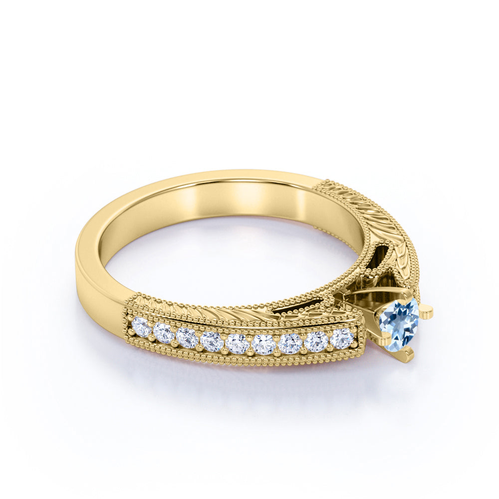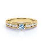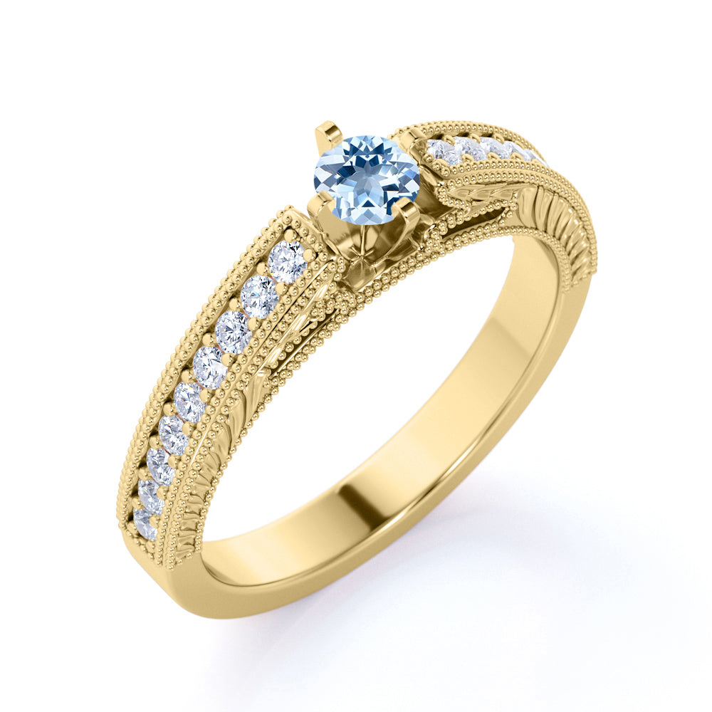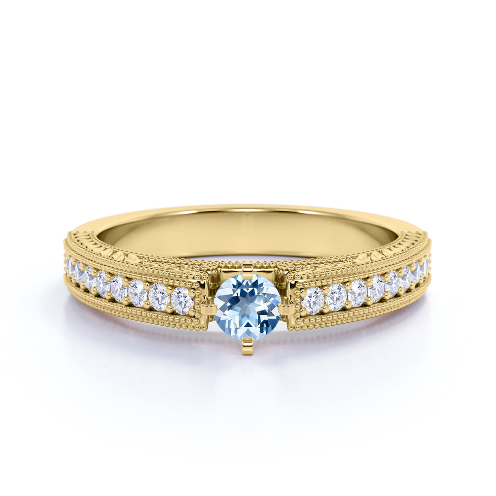 If you are looking for engagement rings, wedding rings, promise rings, anniversary rings, or any other rings, your mind may automatically think of Moissanite rings. But that doesn't have to be your only option. This 1 carat Round Sky Blue created Aquamarine & Moissanite Modern Anniversary Ring in 18k Yellow Gold over Silver will show you why. Made with love and care, this aquamarine pave ring can also be a perfect alternative for an engagement, anniversary or promise ring. This aquamarine birthstone ring is made with created gemstone and real gold over silver yet very affordable. This brazilian aquamarine silver ring is very affordable and well suited for everyday wear. This simple yet elegant art deco aquamarine ring is handmade with love and passion. It is the perfect alternative to the traditional gemstone rings. It features round created light blue aquamarine and real genuine Moissanites. Also, as your satisfaction is our most priority, we will do our best to have your handmade jewelry be carefully and beautifully crafted by our expert jewelers. The order also comes with a 30-day full refund policy.