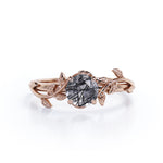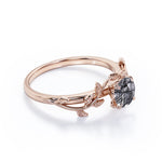 1 Carat Solitaire Round Cut Black Rutilated Quartz Vine and Leaf Engagement Ring 18K Rose Gold Plating Over Silver