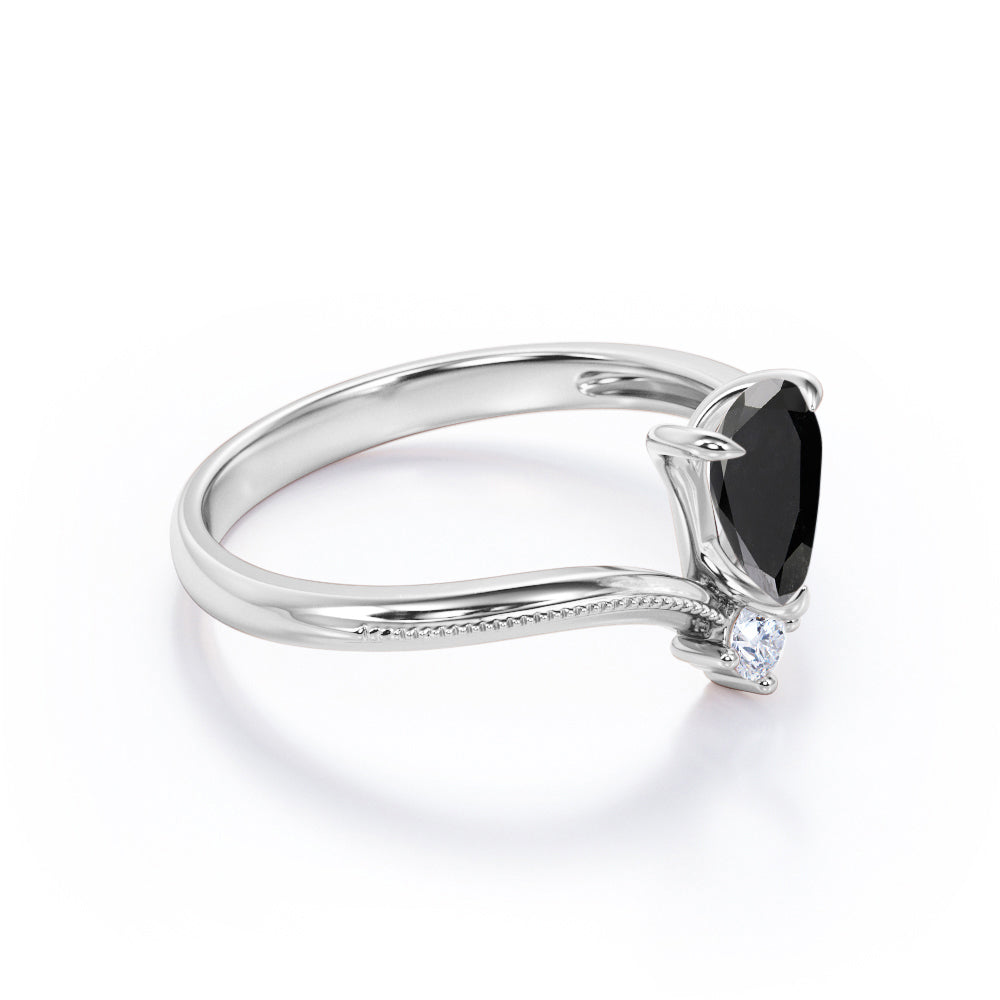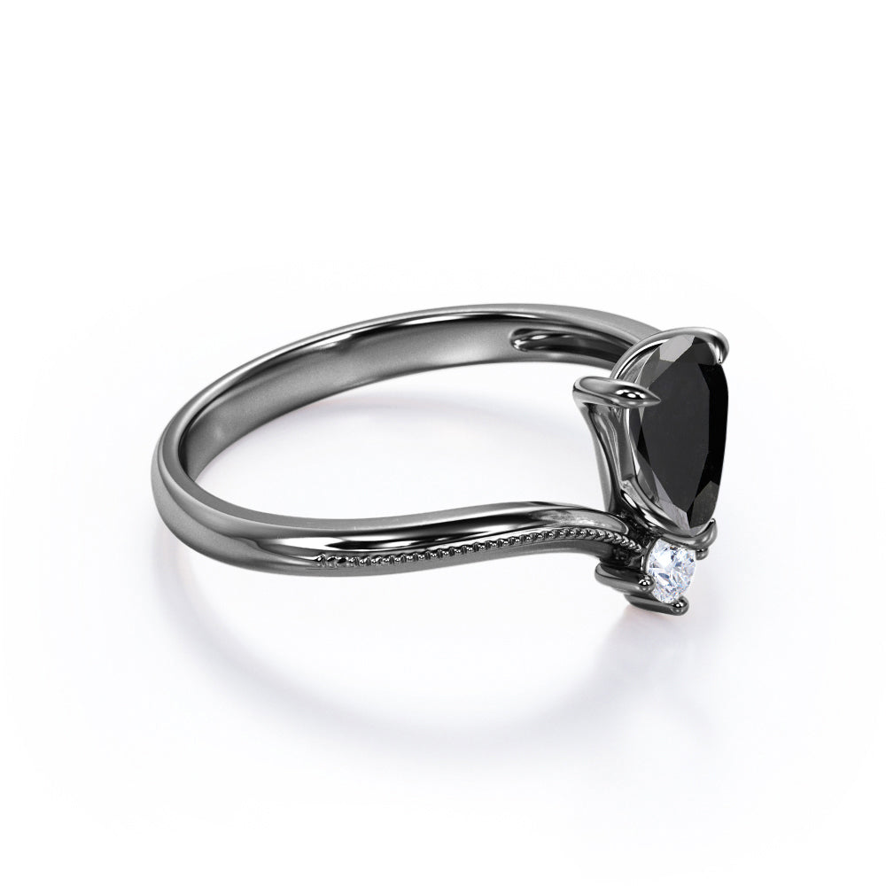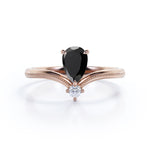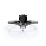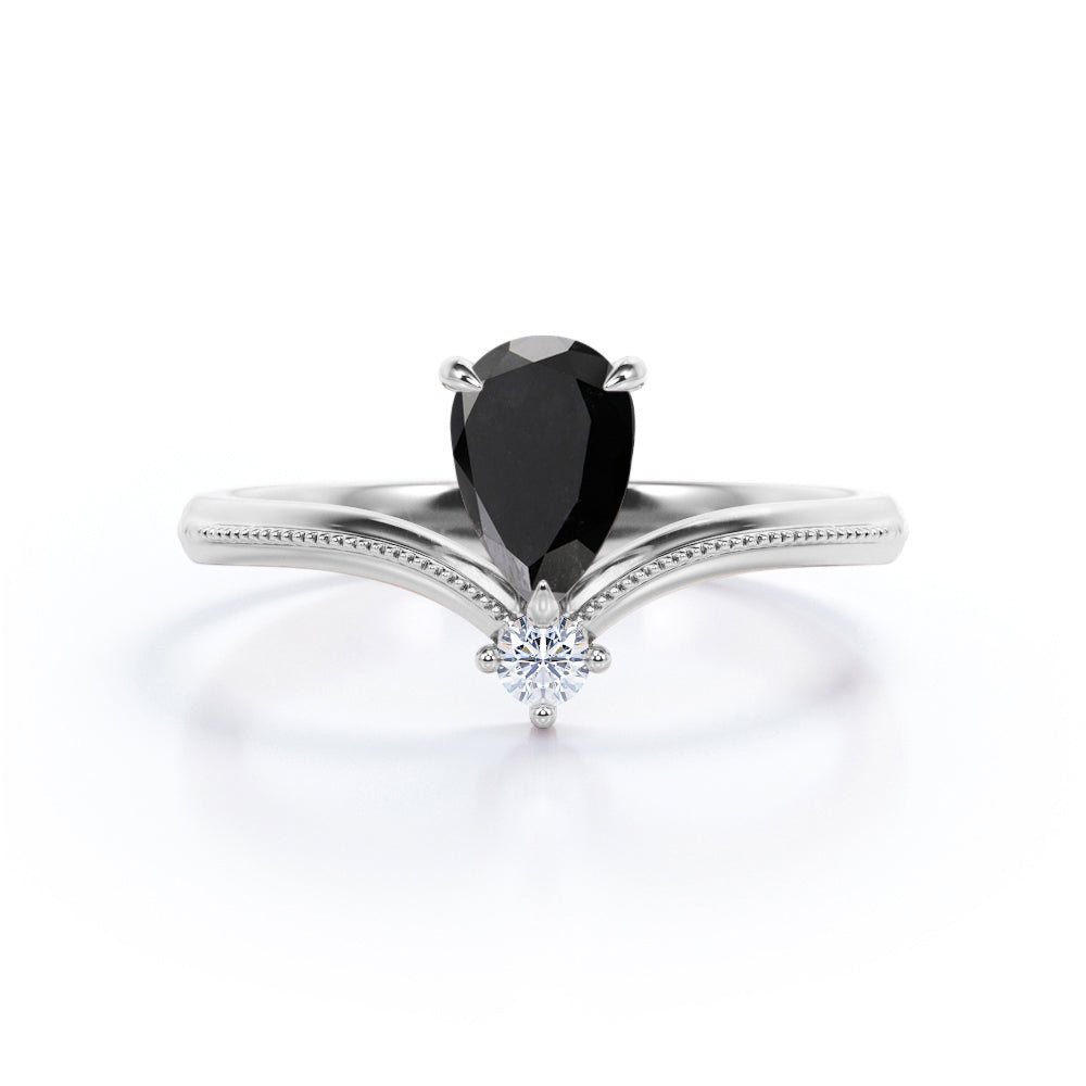 1 carat tear drop cut Black Diamond V shaped style engagement ring in white gold