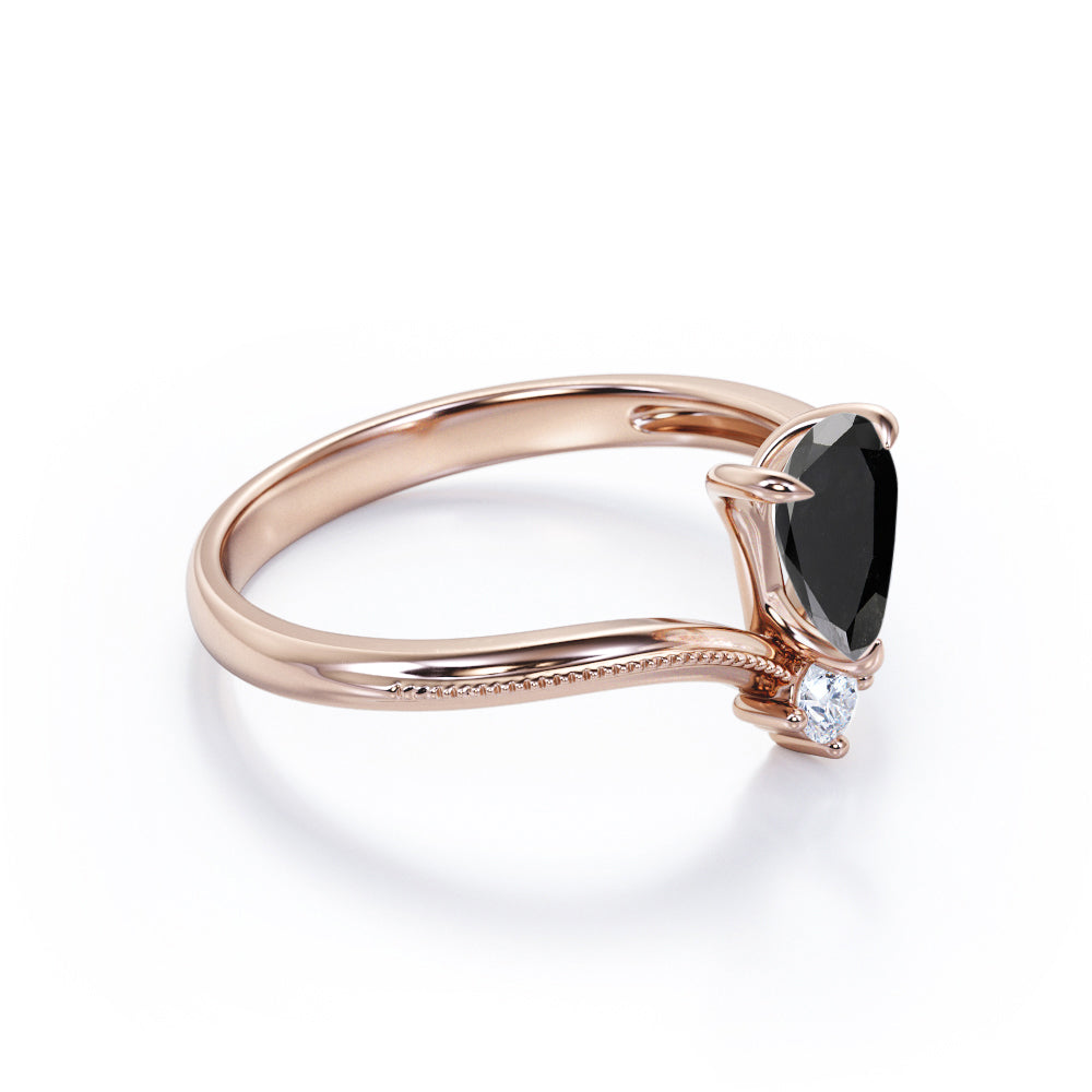 1 carat tear drop cut Black Diamond V shaped style engagement ring in white gold. Be fabulous in our Black Diamond engagement ring. The tear drop cut ring features 1 carat Black Diamonds. This V shaped engagement ring offers a unique appearance and provides a stylish look. The filigree work on the band makes this ring an antique piece. Order this engagement ring now as it is handmade with love and care by our well-experienced artisans. This 1 carat tear drop cut Black Diamond V shaped style engagement ring in white gold can also be customized to 10k Gold, 14k Gold.