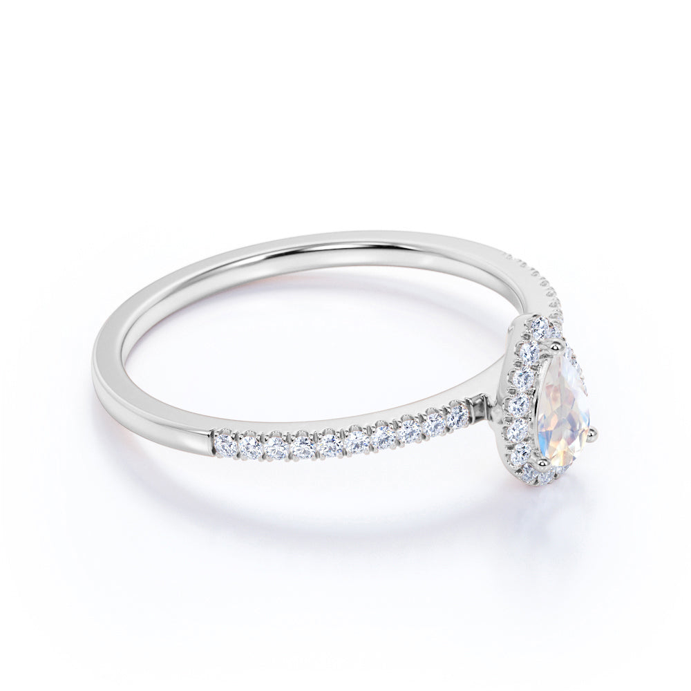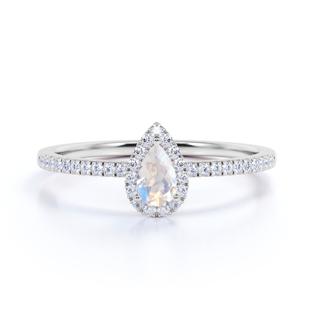 1 Carat Teardrop Rainbow Moonstone and Moissanite Halo Dainty Ring in 18k White Gold over Silver