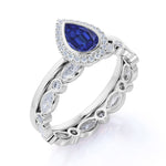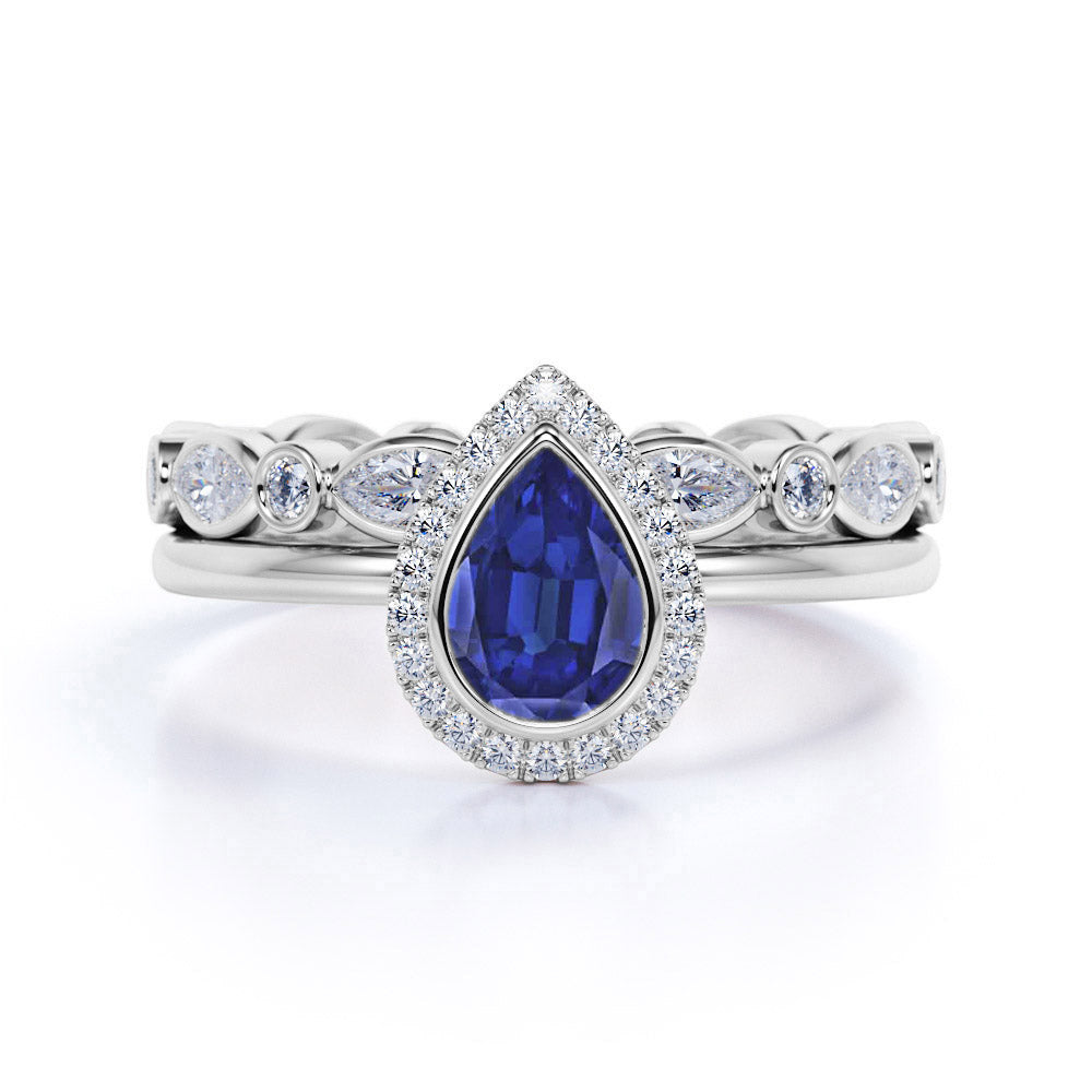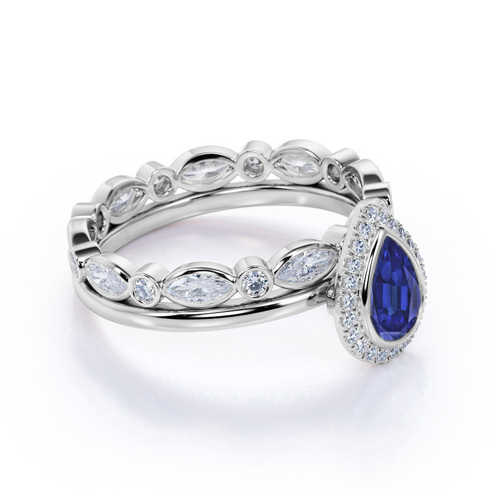 Classic Bezel Set 2.25 Carat Pear Cut Sapphire and Diamond Halo Wedding Set with Art Deco Eternity Band in White Gold