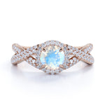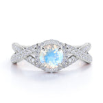 The colorful play of light from this faceted blue moonstone and diamond halo engagement ring will surely put a sparkle in your eyes. This moonstone engagement ring features an approximately 1 carat round cut natural blue moonstone, surrounded by .25 carat real diamonds for gold ring and moissanite for silver ring, for a total weight of 1.25 carats.
