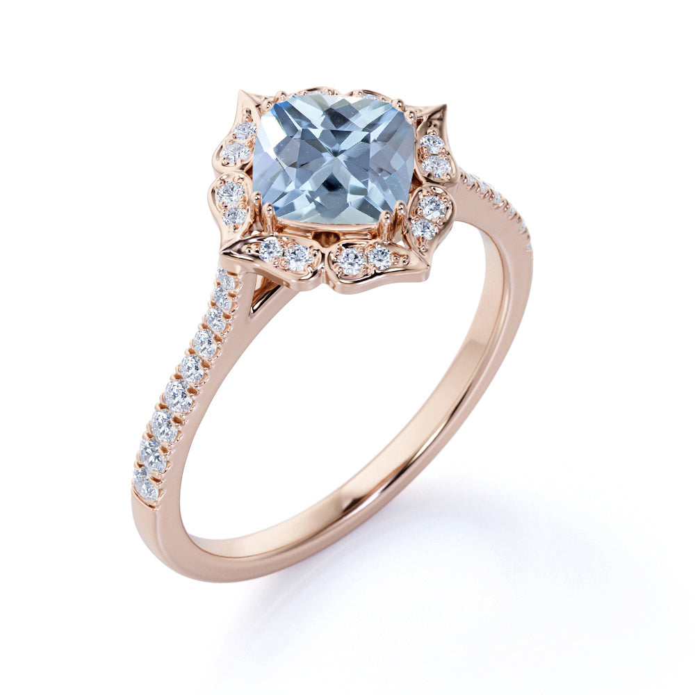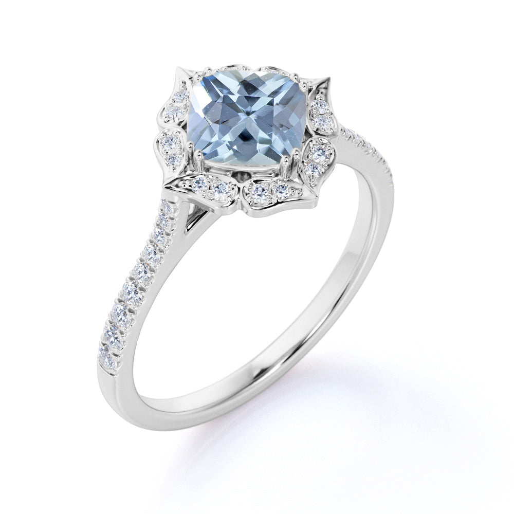 Flower Style 1.50 ct Cushion Aquamarine Halo Engagement Ring