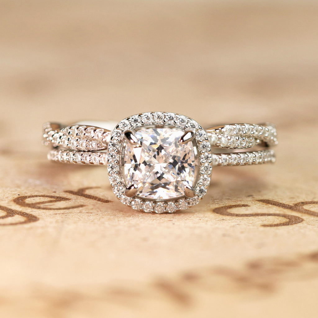 Pave 2 Carat Cushion Cut Moissanite Halo Bridal Set
