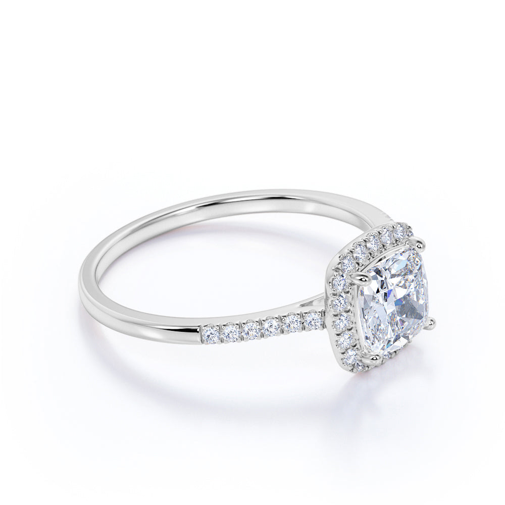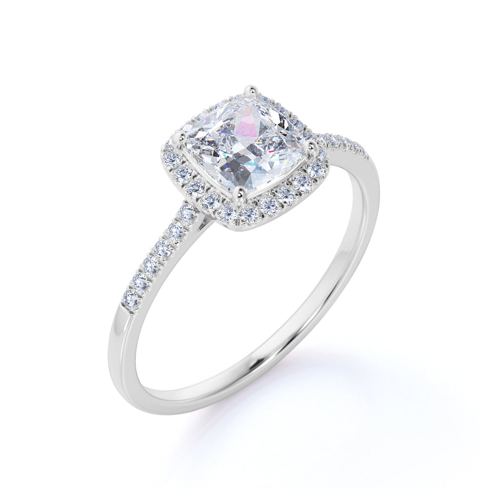 1.50 Carat Cushion Cut Moissanite and Diamonds Halo Engagement Ring in White Gold