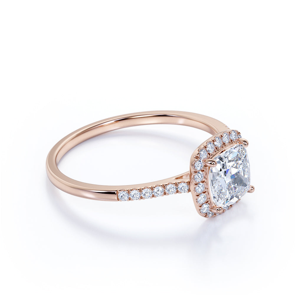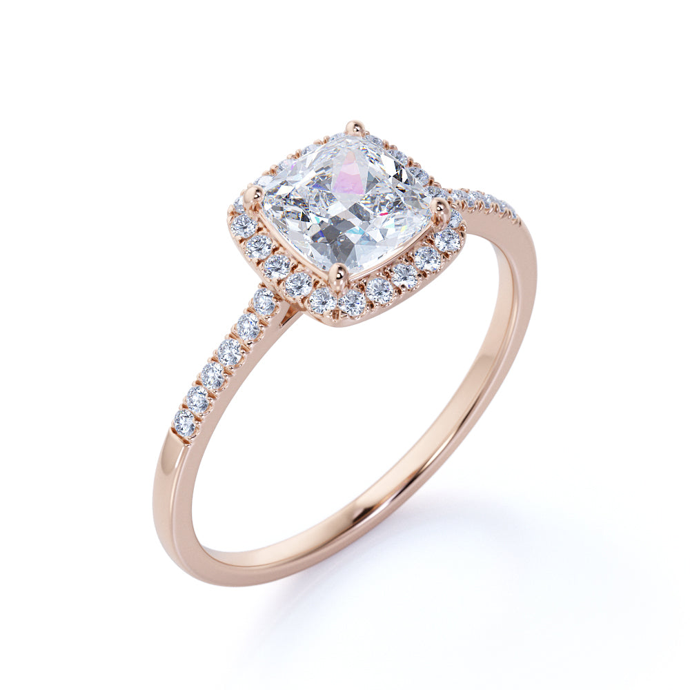 Make a romantic proposal with this unique, stunning engagement and wedding ring for women. This eye-catching style showcases a 1 carat white moissanite in cushion cut, surrounded by .50 carat sparkling diamonds. Captivating with a total of 1.50 carats of gemstones, this engagement ring of style is as lovely as she is.