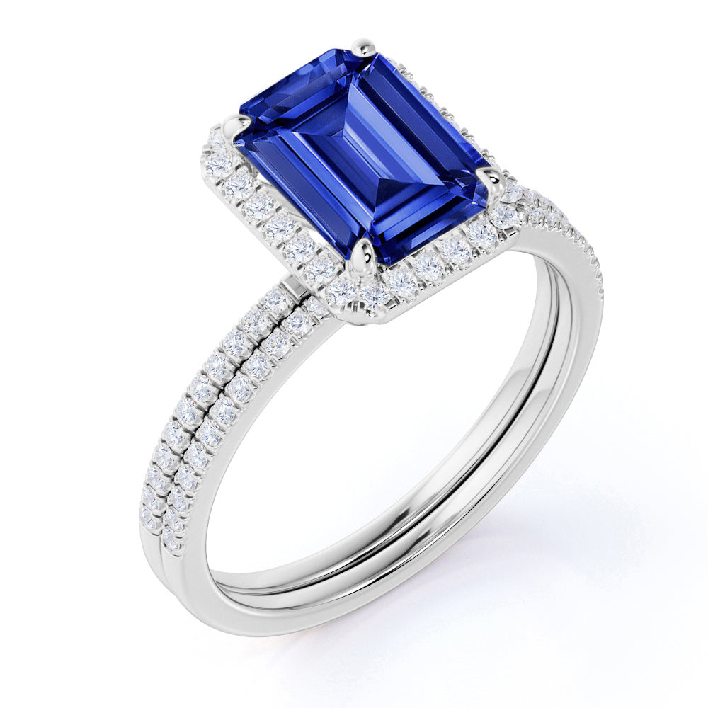 2 Carat emerald cut Blue Sapphire and Diamond Halo Bridal Wedding Ring Set