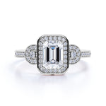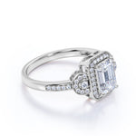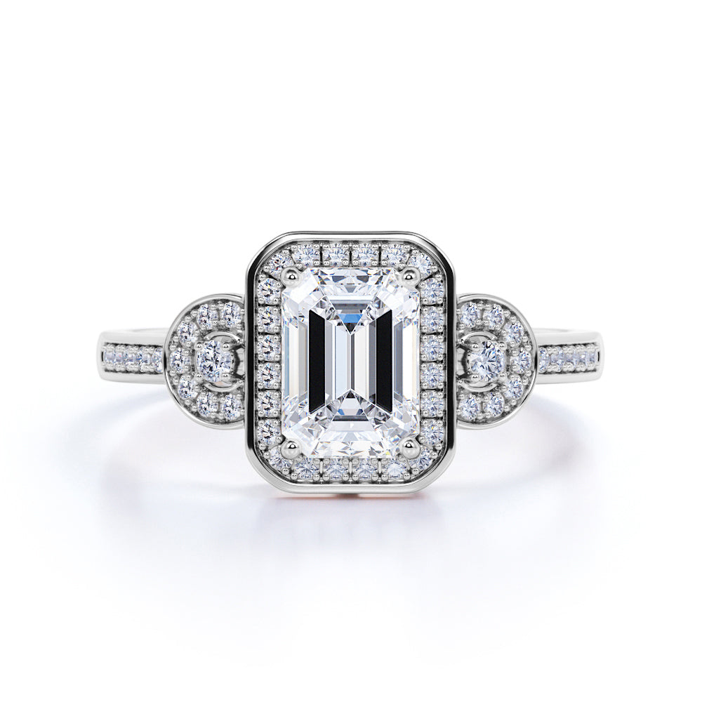 1.75 Carat Emerald Cut Moissanite and Diamond Halo Engagement Ring in White Gold