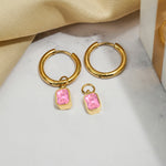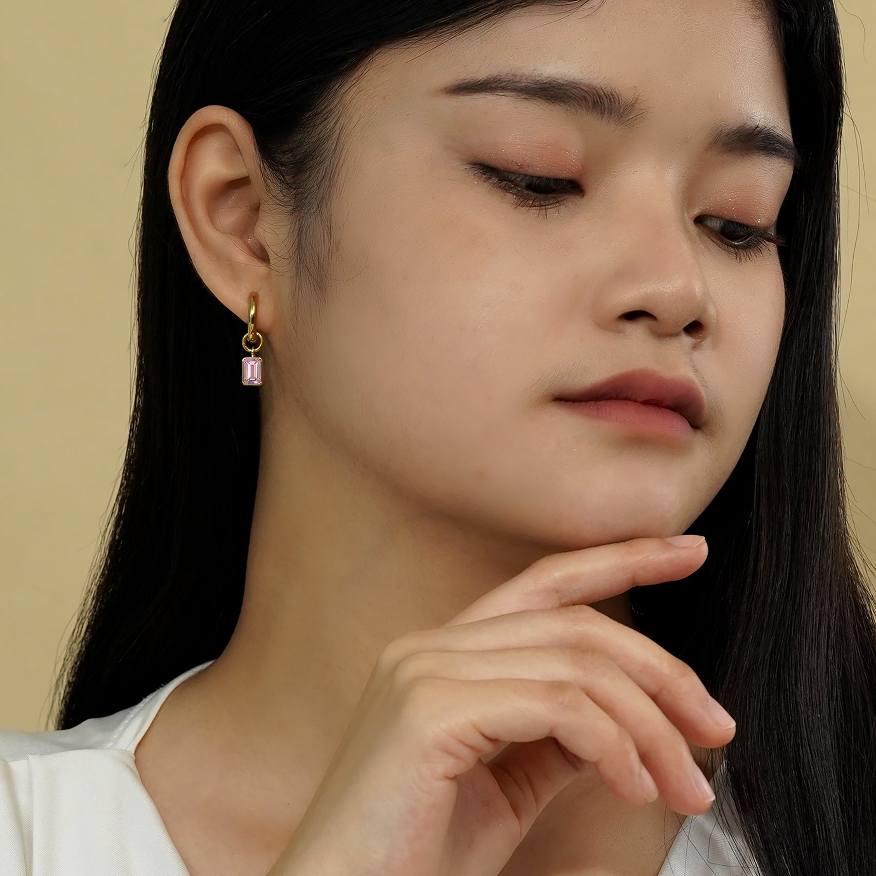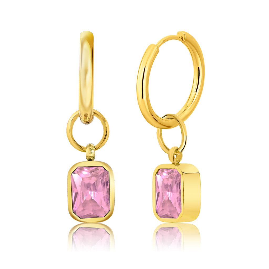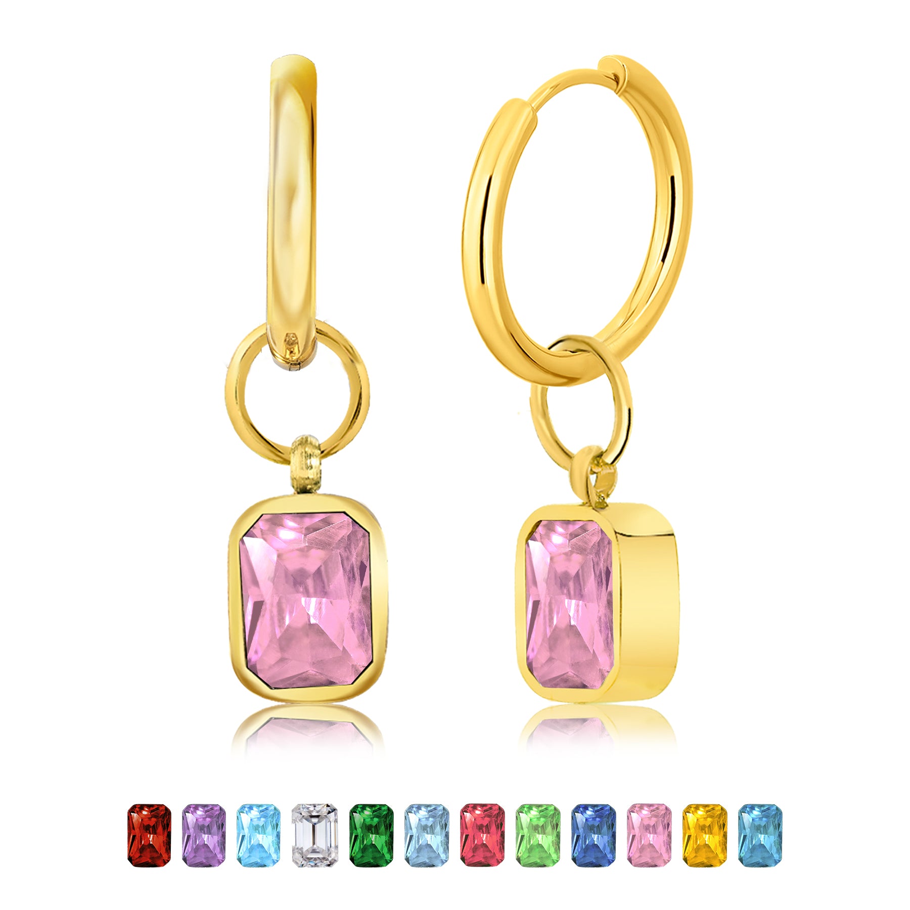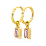 2 Carat Emerald Cut - Pink Tourmaline - October Birthstone Bezel Huggie Hoop Earrings - 18K Yellow Gold Plating