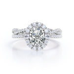 2 carat oval cut Moissanite and diamond halo bridal set in white gold. If you are willing to go that extra mile for her, shower your immense love to her with our Moissanite and diamond bridal set. The halo wedding set comprises of oval cut Moissanite of 1 carat and .50 carat diamond in the main engagement ring and a wedding band with .50 carat of diamonds in white gold. This infinity ring features VS clarity, G-H color Moissanite and I-J color diamonds. The shining diamonds are paved beautifully with detailed attention by our experienced artisans which magnifies the overall brilliance of this bridal set. This 2 carat oval cut Moissanite and diamond halo bridal set in white gold can also be customized to 18k Gold plating over silver, 10k Gold, 14k Gold or 18k Gold.