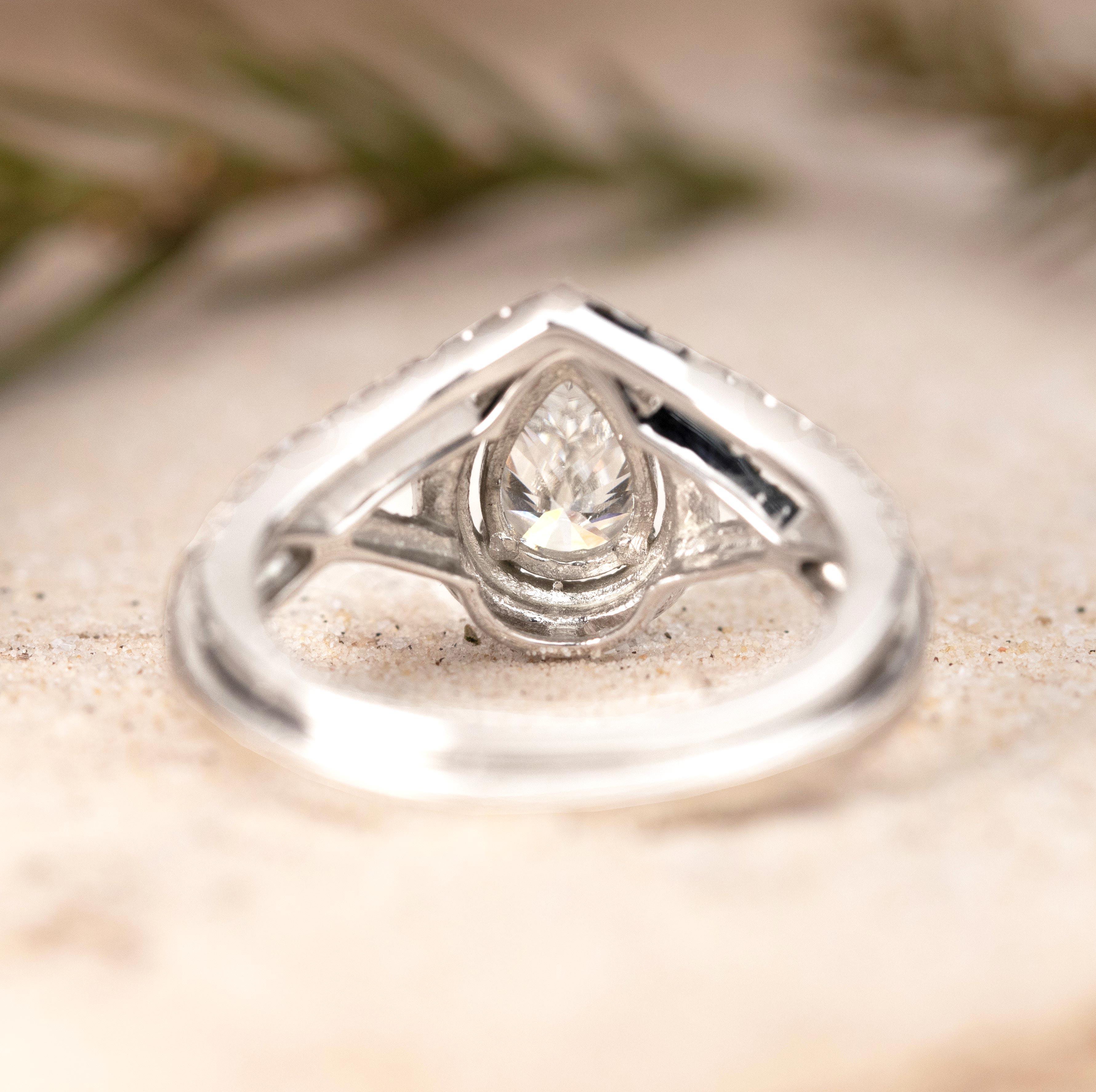 An exquisite style 1.75 Carat Pear Cut Real Moissanite Bridal Set in 18k White Gold Over Silver. The art deco and halo design engagement ring is made with natural and real moissanite, high quality zirconium, and 18k gold plating over silver. To accompany your vows, a matching classic wedding band completes this beautiful look. This piece of jewelry is handmade, sporting quality craftsmanship that will last for years to come. As always, the order comes with 30 days full refund policy. The beautiful moissanite ring also comes in a very beautiful jewelry ring pouch.