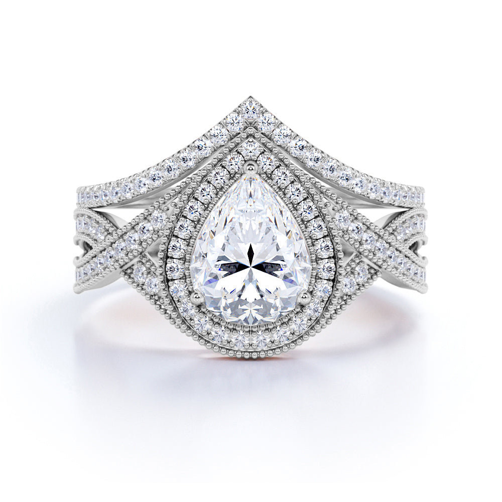 1.75 Carat Pear Cut Moissanite Wedding Set - Bridal Set - Art Deco Ring - Halo Ring - Cluster Ring - 18k White Gold Over Silver