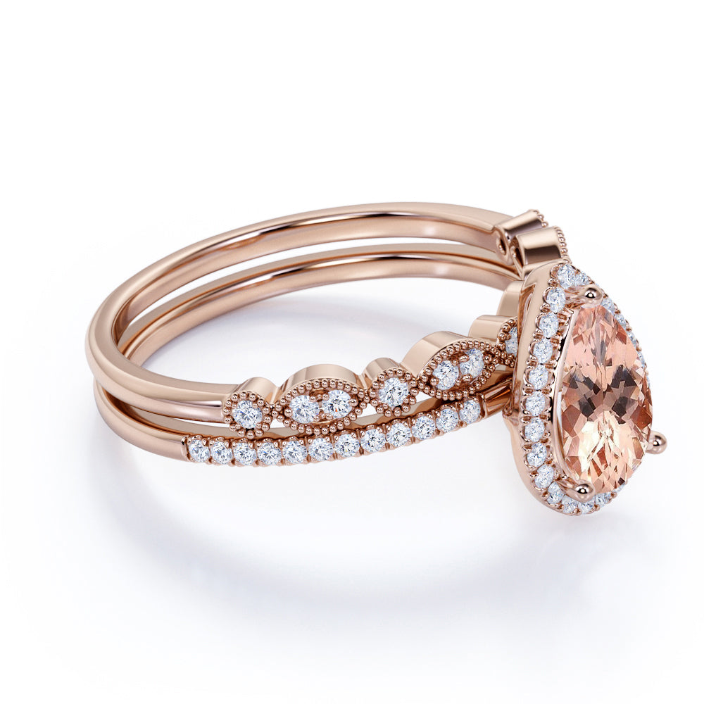 2 carat pear cut morganite and moissanite antique milgrain wedding set on 18k rose gold over silver. Handmade and customized to your requirement, the beautiful engagement ring celebrates true love at very affordable price. The beautiful and classic morganite engagement ring for women is sure to please her at very first sight. The bridal wedding ring is crafted in 18k Gold over Silver and made with real and high quality Moissanites that can be a perfect alternative to diamond rings as moissanites have almost the same durability and quality as with diamonds that will last for a lifetime.