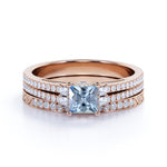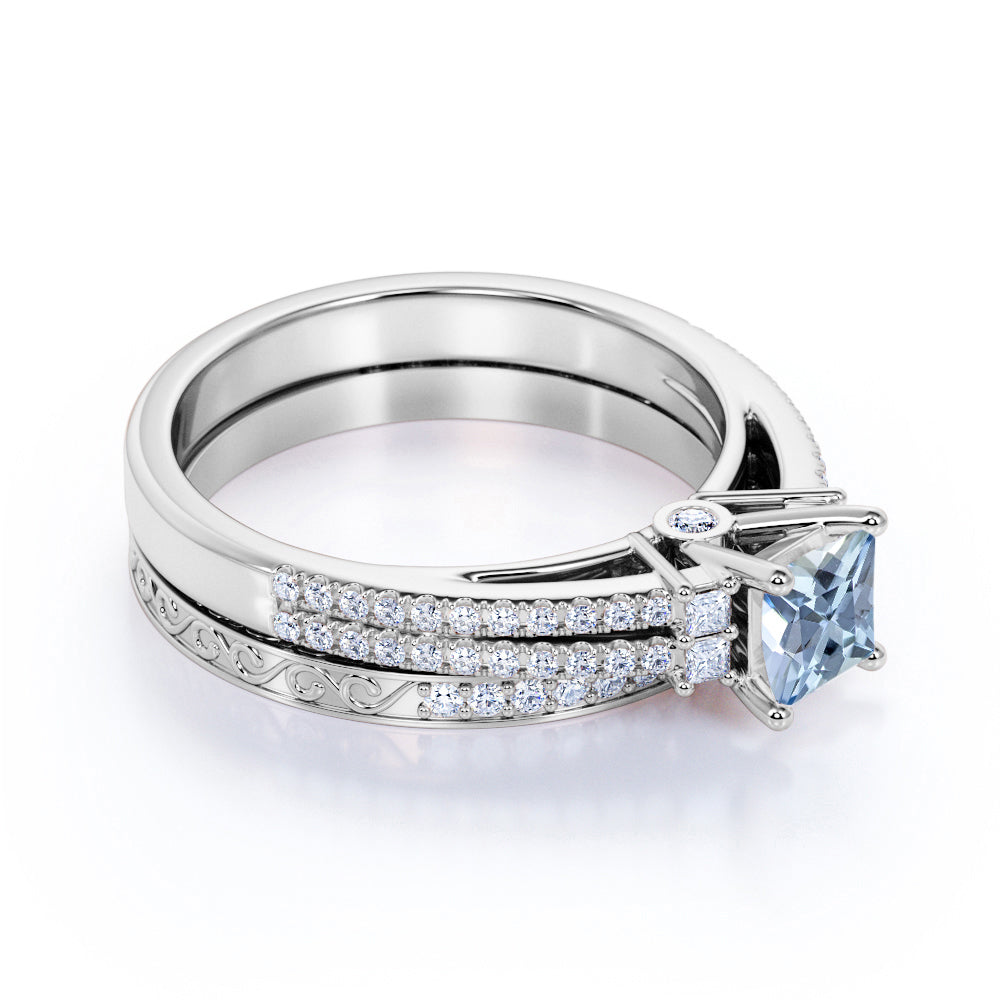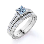 1.50 Carat princess cut Aquamarine and Diamond Halo Wedding Set in White Gold