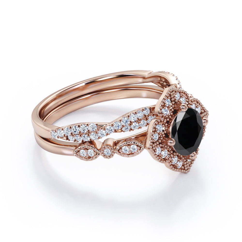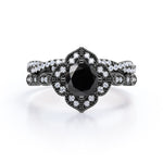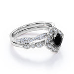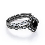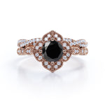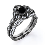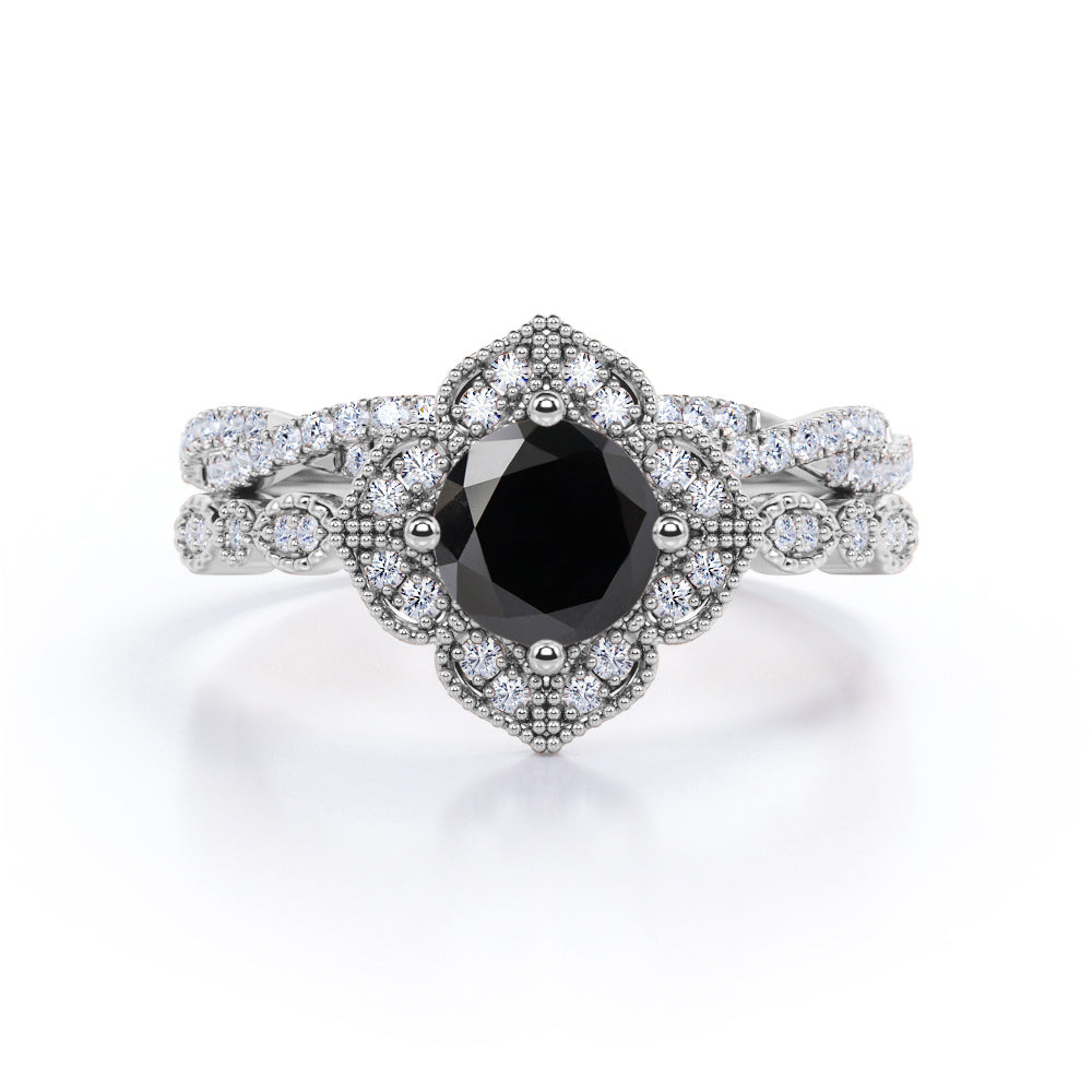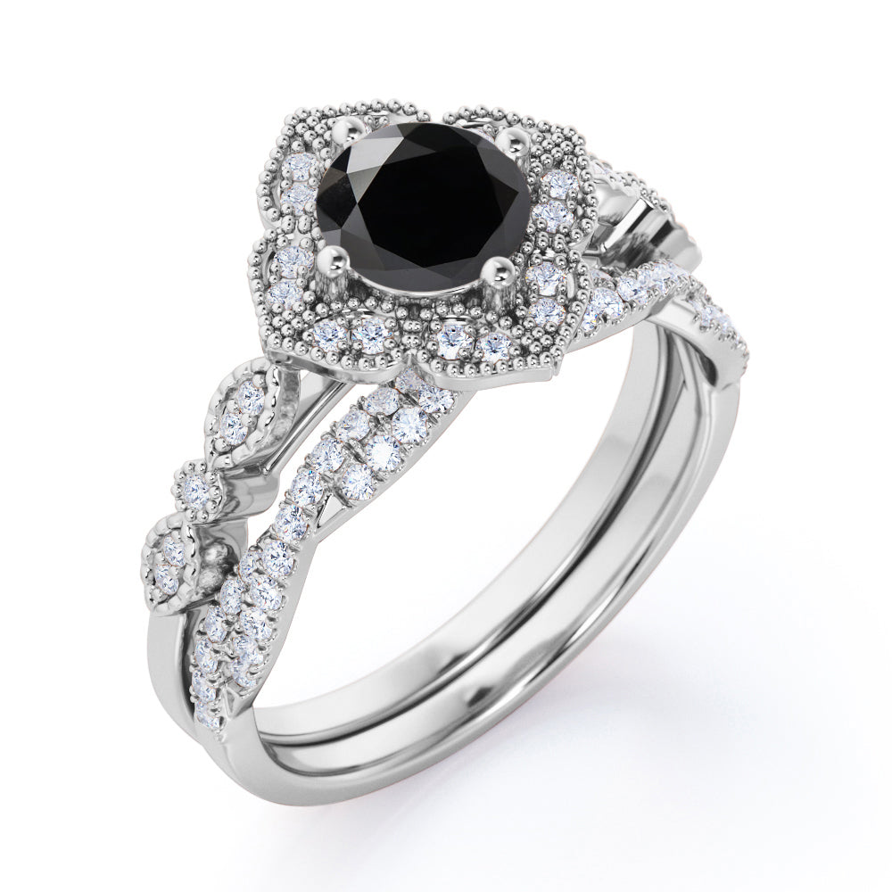 2 carat round cut Black Diamond art deco wedding ring set in white gold. Showcasing one of our vintage collection for all the vintage lovers out there. This Black Diamond infinity wedding ring set is a show-piece. You won't be able to stop staring at this round cut vintage wedding ring set which features 1 carat Black Diamond in the main engagement ring and 1 carat diamonds inclusive of the wedding band. This art deco style ring is handmade by our artisans which has detailed milgrain work at the edges surrounding the glistening diamonds. This nature inspired wedding ring set will be an absolute worthy purchase. This 2 carat round cut Black Diamond art deco wedding ring set in white gold can also be customized to 10k Gold, 14k Gold.