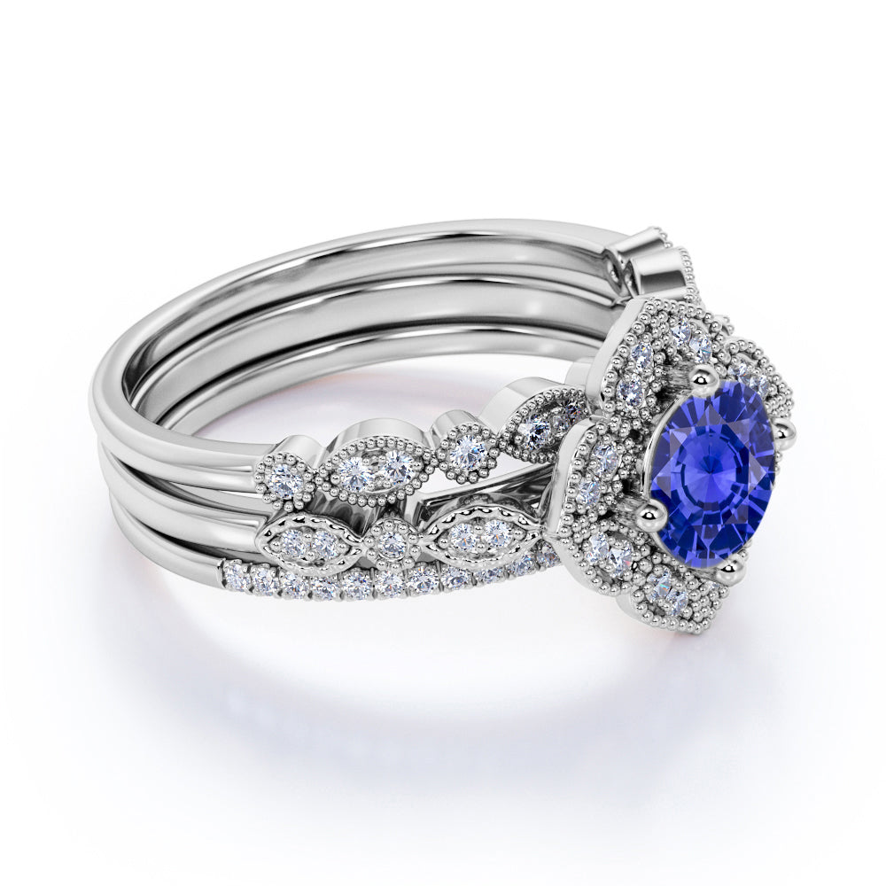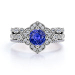 This is a very beautiful handmade art deco style sapphire and diamond trio wedding ring set for women featuring the main engagement ring along with 2 matching wedding ring bands. The trio bridal wedding ring set is made with real sapphire, real diamonds and on real gold. The handcrafted engagement ring features sapphire 1.5 carat round cut sapphire in the center, and the engagement ring and 2 matching wedding ring bands have 0.5 carat of diamonds together, for a total carat weight of 2 Carats. The sapphire engagement trio bridal ring set can be made in either Rose, White or Yellow Gold, and can be customized to your choice of 10k, 14k or 18k Gold. The sapphire trio wedding ring set order comes with its jewelry certificate and the order also comes with 30 days full refund policy.
