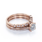 Make every day a cloud nine day with this 2 Carat Round Cut - Art Deco Milgrain Filigree - 4 Prong Pave Set - Trio Bridal Ring Set - 18K Rose Gold Plating over Silver. Skillfully hand-cut into a nice round cut by our skilled jewelers, these affordable women's Moissanite rings showcase 1.5 carat Moissanite and 0.5 carat side stone Moissanite on solid rose gold plating over silver. Special and non-traditional, these high quality Moissanite engagement rings are perfect for those who would love to express their charisma and uniqueness. With naked eyes Moissanite look, shine and feel exactly like diamonds and moissanites. Reflective properties of these Moissanite engagement rings will unquestionably be an essential additional to any jewelry collection. These high quality Moissanite engagement rings are beautiful and accessible since they are available at an affordable price. Moissanite is the most popular alternative gemstone for diamond and moissanite while being at lower and more affordable price. For those who have no idea what to surprise your life partners, these gold Moissanite engagement rings can be a perfect gift for any occasion like engagements, Valentine's day, mother's day or anniversary. These Moissanite engagement rings that look real can be customized, so customers can choose one of metal colors between 18K yellow gold plating over silver, 18K white gold plating over silver, 18K rose gold plating over silver, and 18K black gold plating over silver. Let's fulfill your love story with these best Moissanite engagement rings and she will be eternally joyful.